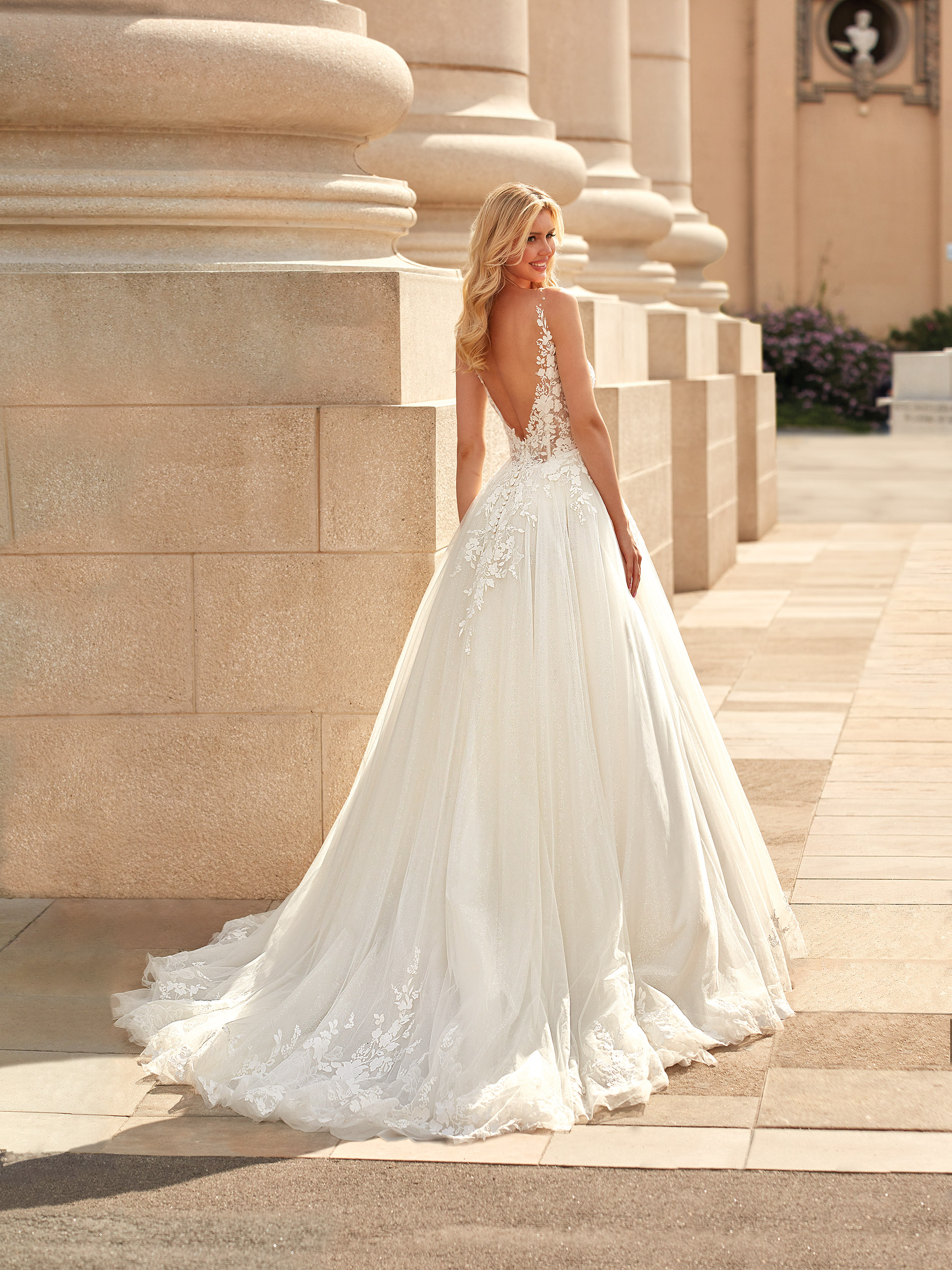Adison is a romantic wedding gown that exudes delicacy and classic charm. The lace straps beautifully accentuate the shoulders, while the V-shaped neckline adds a touch of subtle sensuality. The open back introduces an elegant and bold element, perfectly balancing the overall look. The long skirt with a train flows gracefully, creating a romantic and refined appearance that will undoubtedly captivate on this special day.