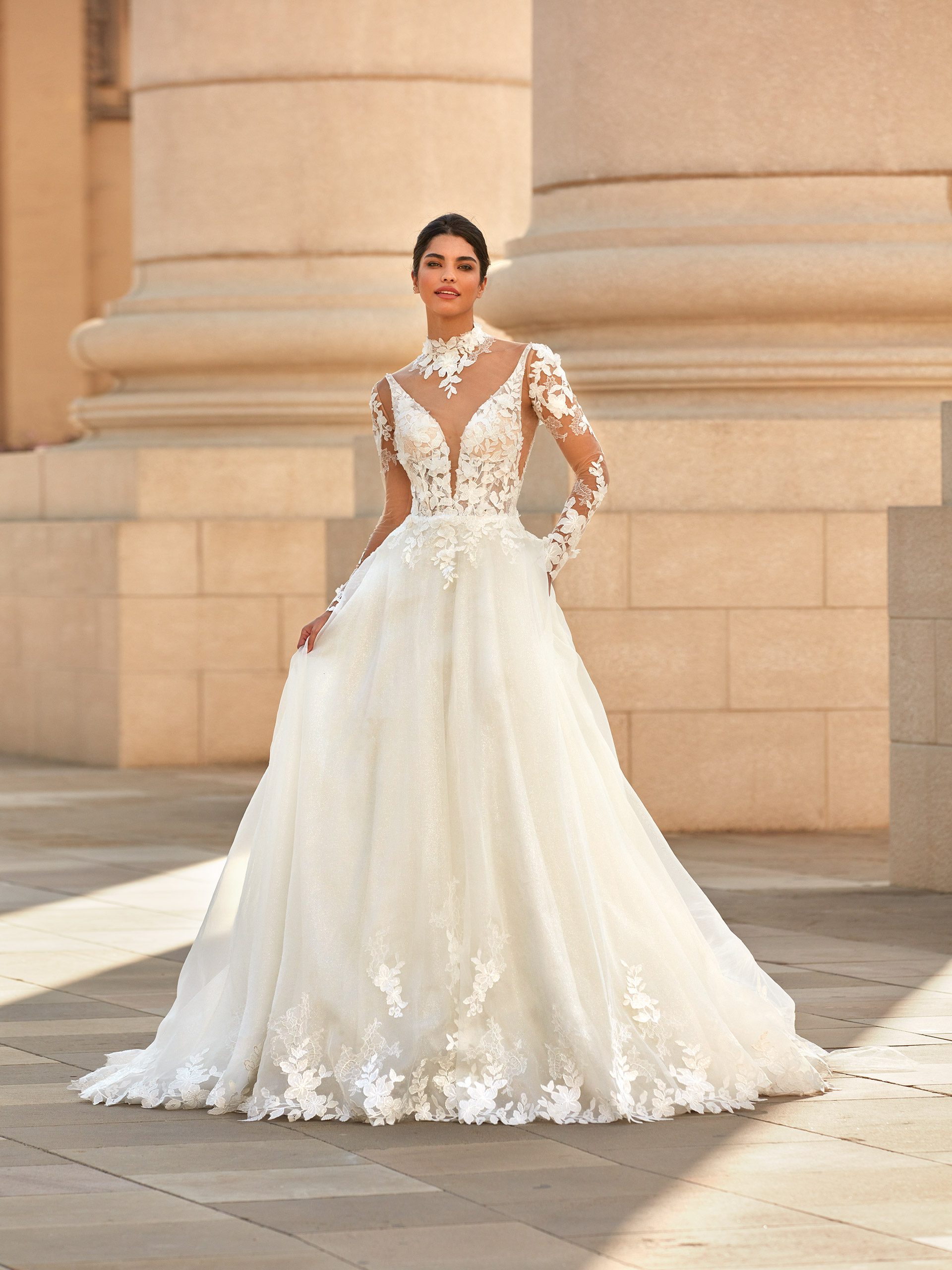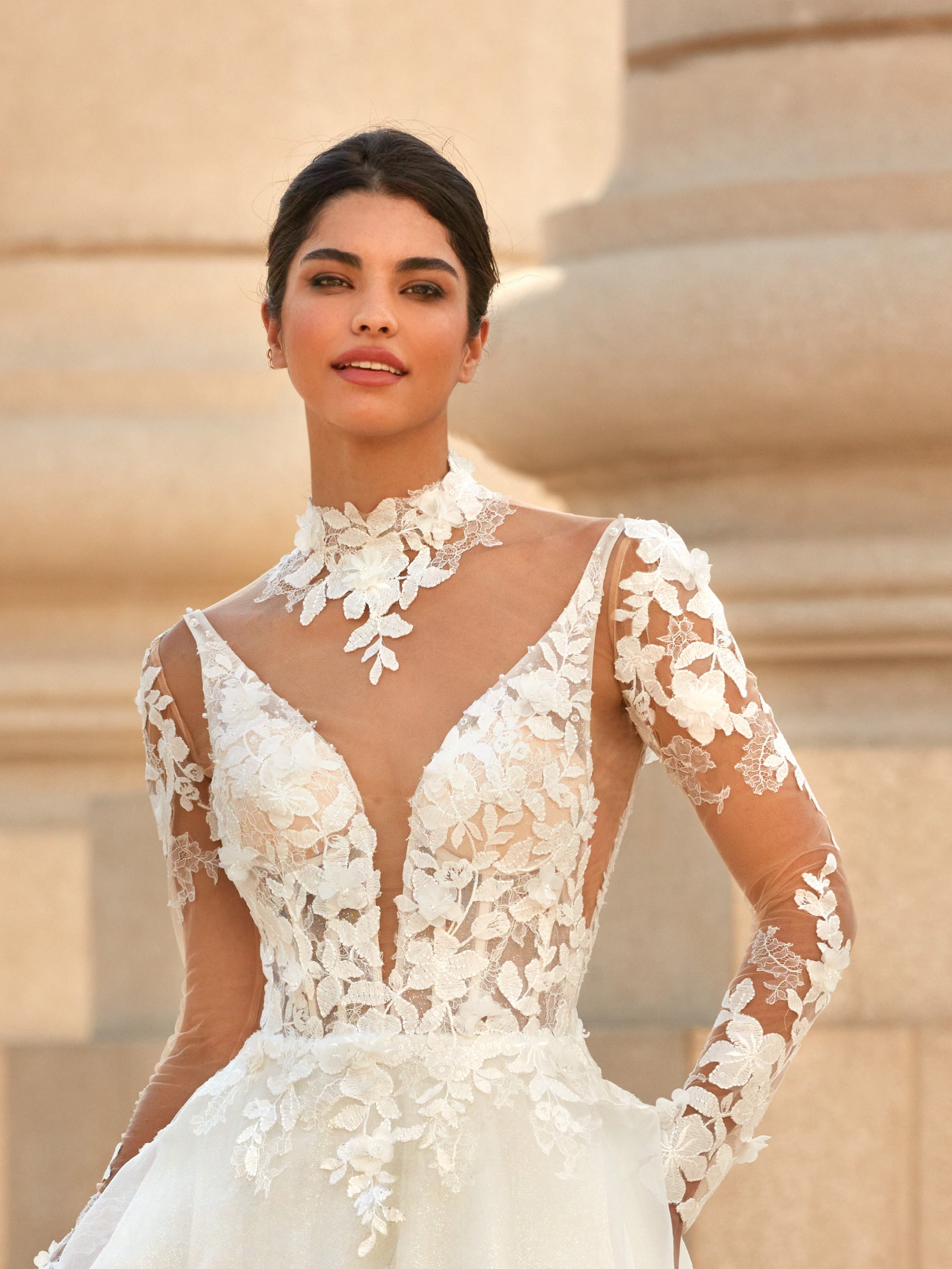 Amelia is an elegant wedding gown that embodies timeless style and sophistication. The bodice with wide straps, crafted from classic lace, perfectly complements the A-line skirt that gracefully flows into a majestic train. The open back, cut in a V-shape, adds a touch of subtle sensuality. The look is completed with an elegant bolero with long sleeves and a lace choker, introducing a unique accent that enhances the chicness of this ensemble.