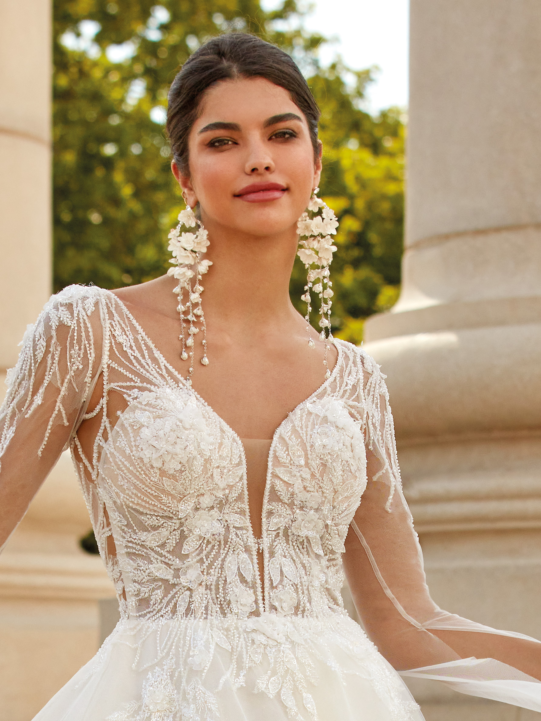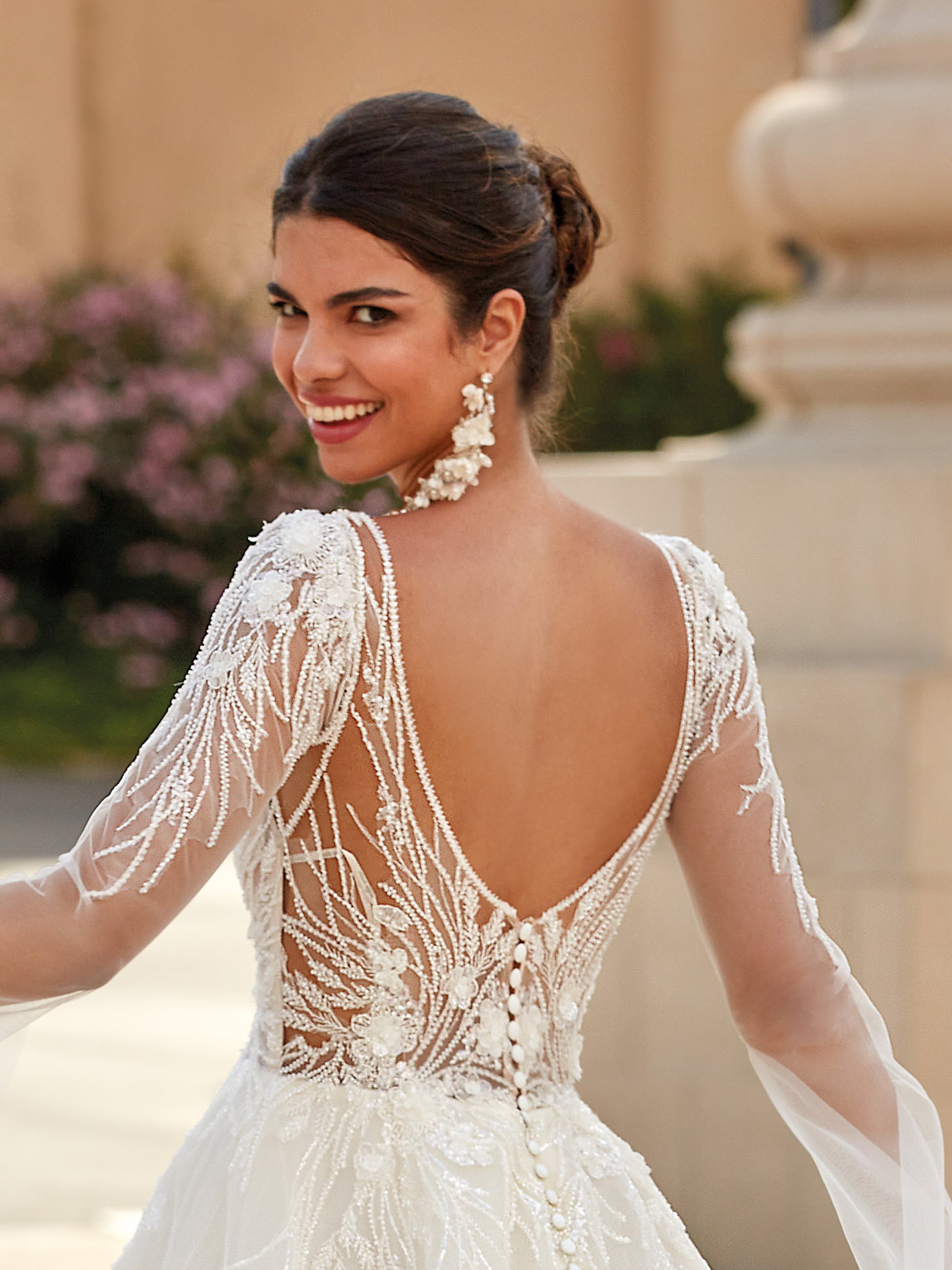 Aurora is a magnificent wedding gown that captivates with its volume and refinement. The voluminous skirt, intricately finished with lace, flows seamlessly into a train, creating an effect worthy of a royal ceremony. The bodice with a deep neckline accentuates the figure, while the long sleeves with their majestic and airy finish add delicacy and elegance to the dress. The open back introduces a touch of subtle sensuality, and the zipper closure ensures a perfect fit