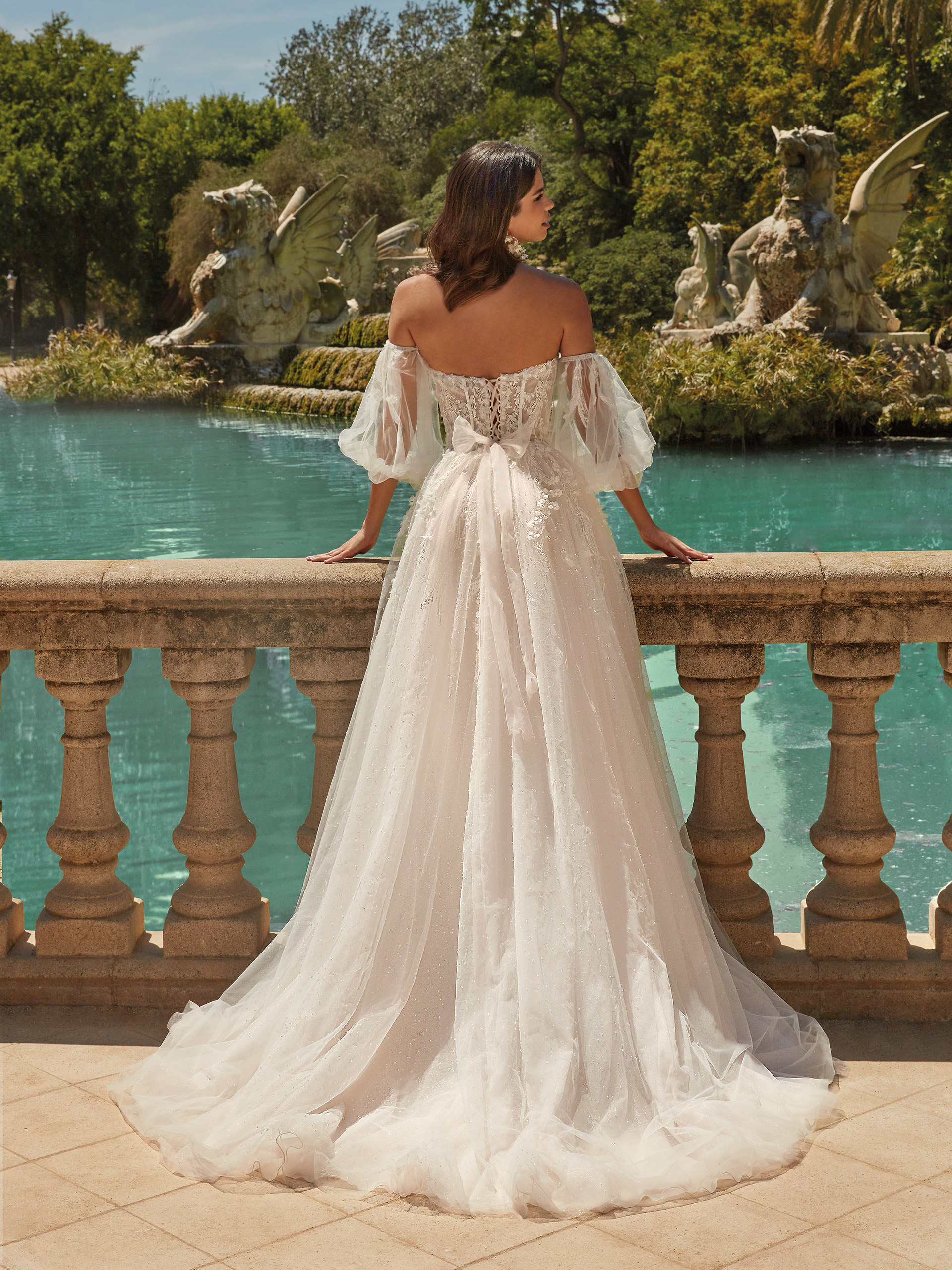 The romantic Eden gown enchants with its subtlety and intricate details. The semi-sheer bodice with visible boning and delicate lacing is adorned with unique lace, giving the dress a distinctive character. Delicate tulle off-the-shoulder sleeves add lightness and grace to the ensemble. The long skirt made of shimmering tulle, finished with a small train, enhances the gown`s romantic appeal. Perfect for a bride who wishes to look dazzling and elegant.