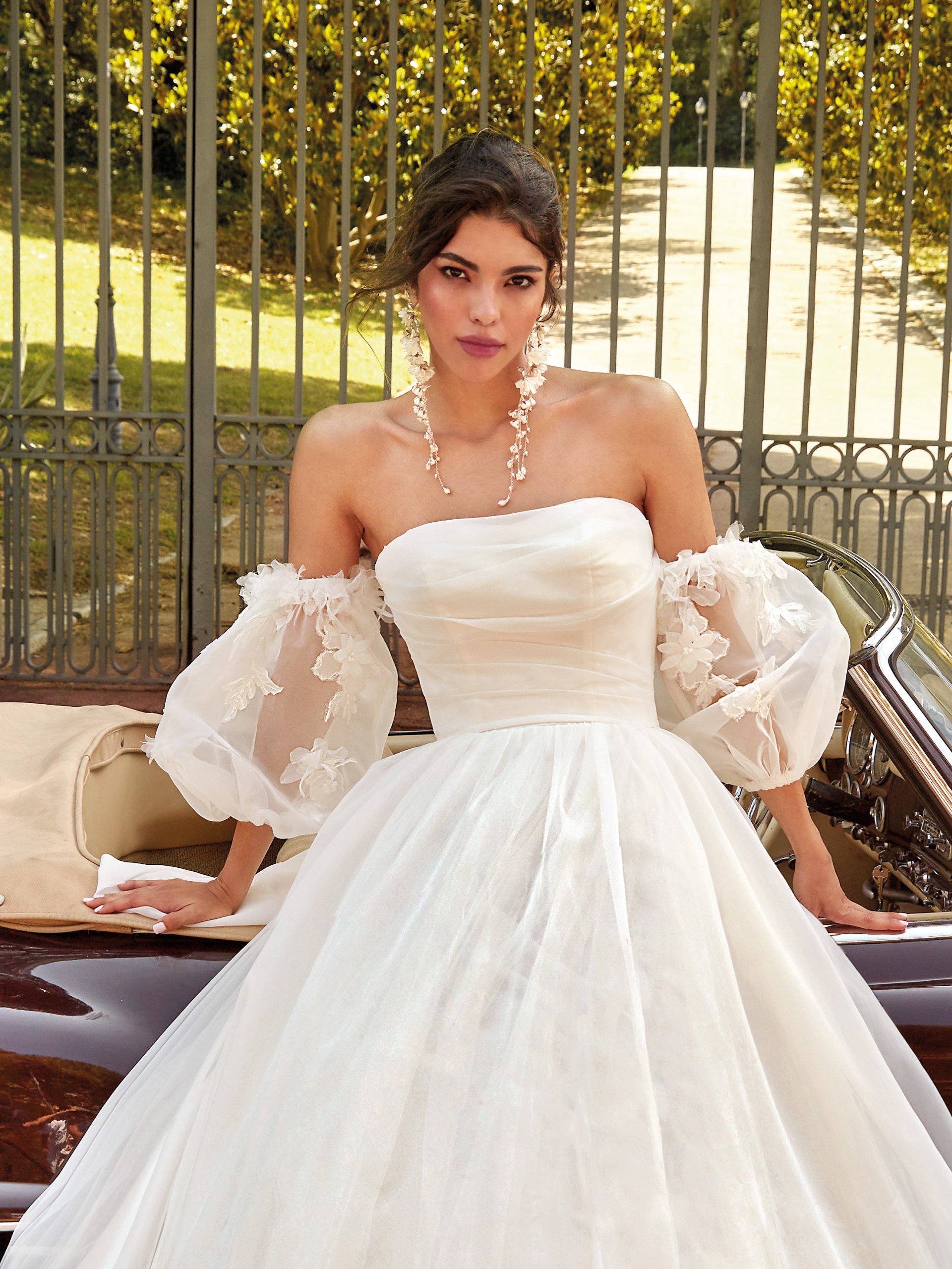 The elegant Elda wedding dress is a unique creation that exudes sophistication and charm. The voluminous tulle skirt provides lightness and a grand appearance, while the lace adorned with original flowers adds a distinctive character to the dress. The flat neckline with tulle draping accentuates delicacy and subtlety. The zip-up bodice ensures a perfect fit, and the tulle puff sleeves with lace and decorative bow add a romantic touch. The train completes the look, creating an unforgettable effect.