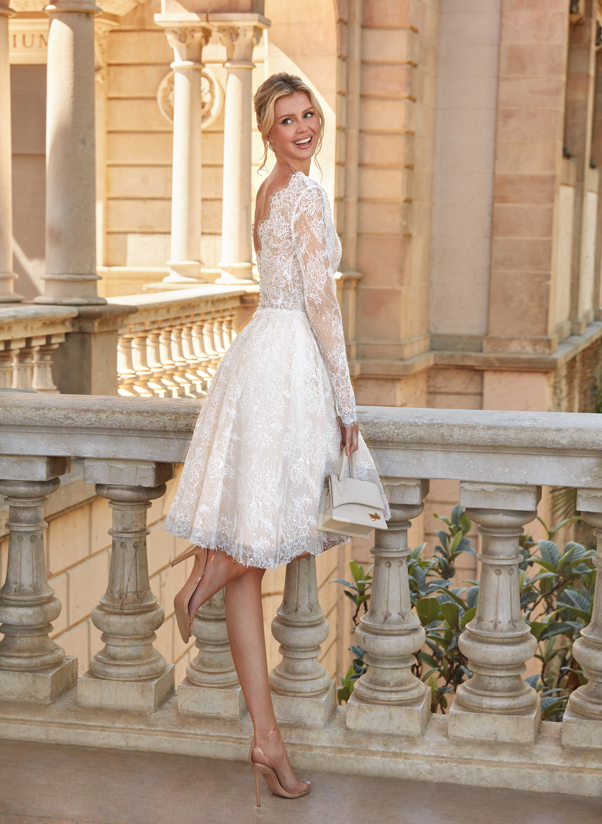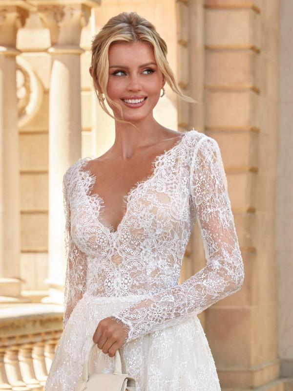 The elegant Elieen wedding dress is a short masterpiece crafted from delicate French lace. It features long sleeves and a V-shaped neckline, adding a touch of subtle sensuality. The open back highlights the elegance and modern character of the dress, making it the perfect choice for a bride who wants to captivate with her appearance.