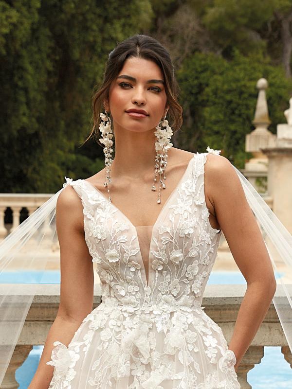 Ella is a fairytale wedding gown that transports you to a dreamlike world with its airy skirt and train, covered in delicate lace with 3D elements. The bodice with a V-shaped neckline subtly accentuates the figure, while wide straps add elegance and comfort. The look is completed with majestic tulle sashes that flow gracefully, creating an effect of lightness and enchantment, perfect for a truly special wedding.