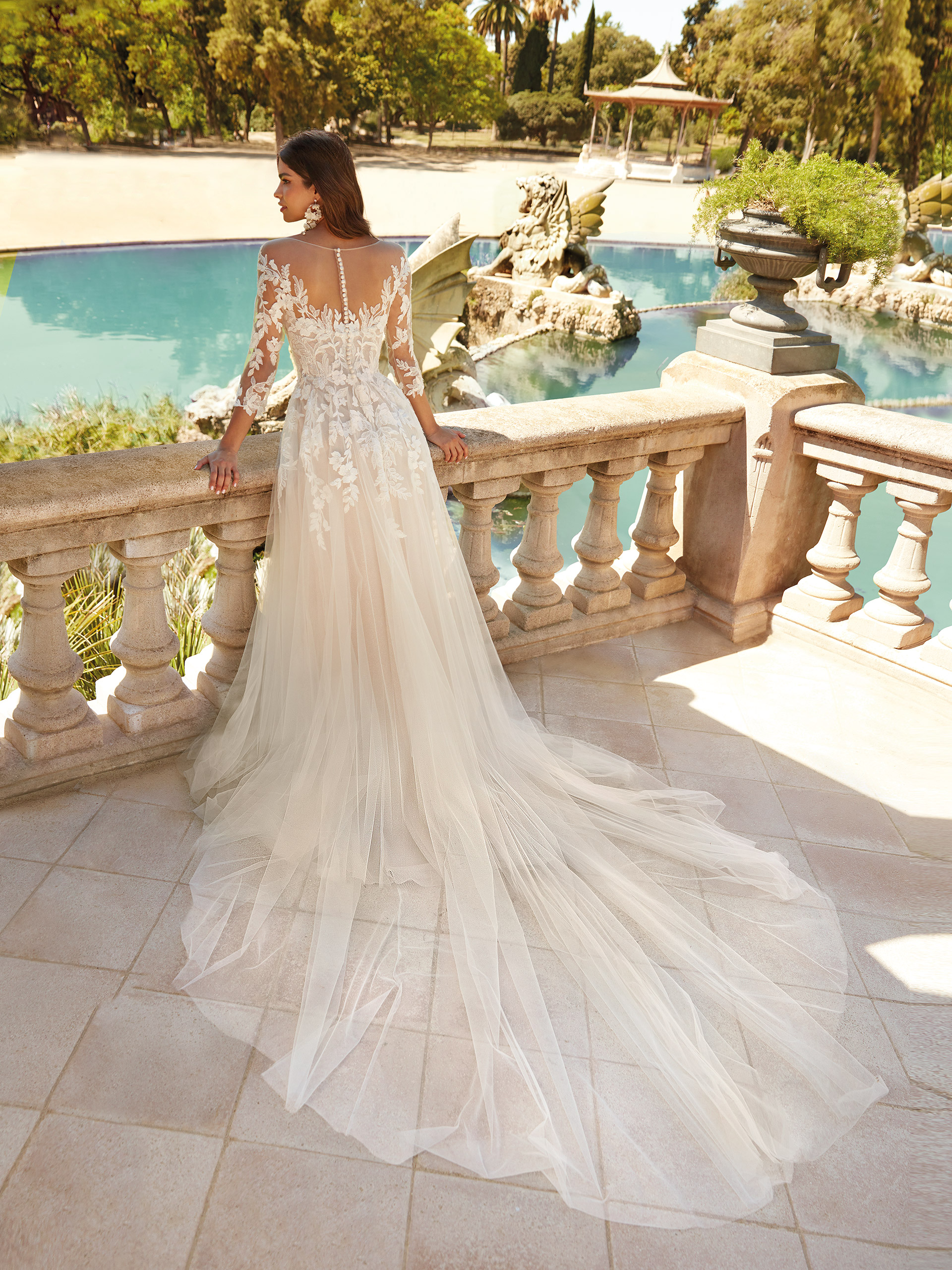 The Erica gown, with its A-line silhouette, enchants with its elegance and subtlety. The matte lace adorning the bodice and sleeves adds a touch of romantic charm, highlighting the delicacy and precision of the craftsmanship. The tulle skirt gracefully transitions into a delicate cathedral train, creating a majestic effect as you move. The open back with buttons adds a sensual touch, perfectly balancing tradition with modernity.