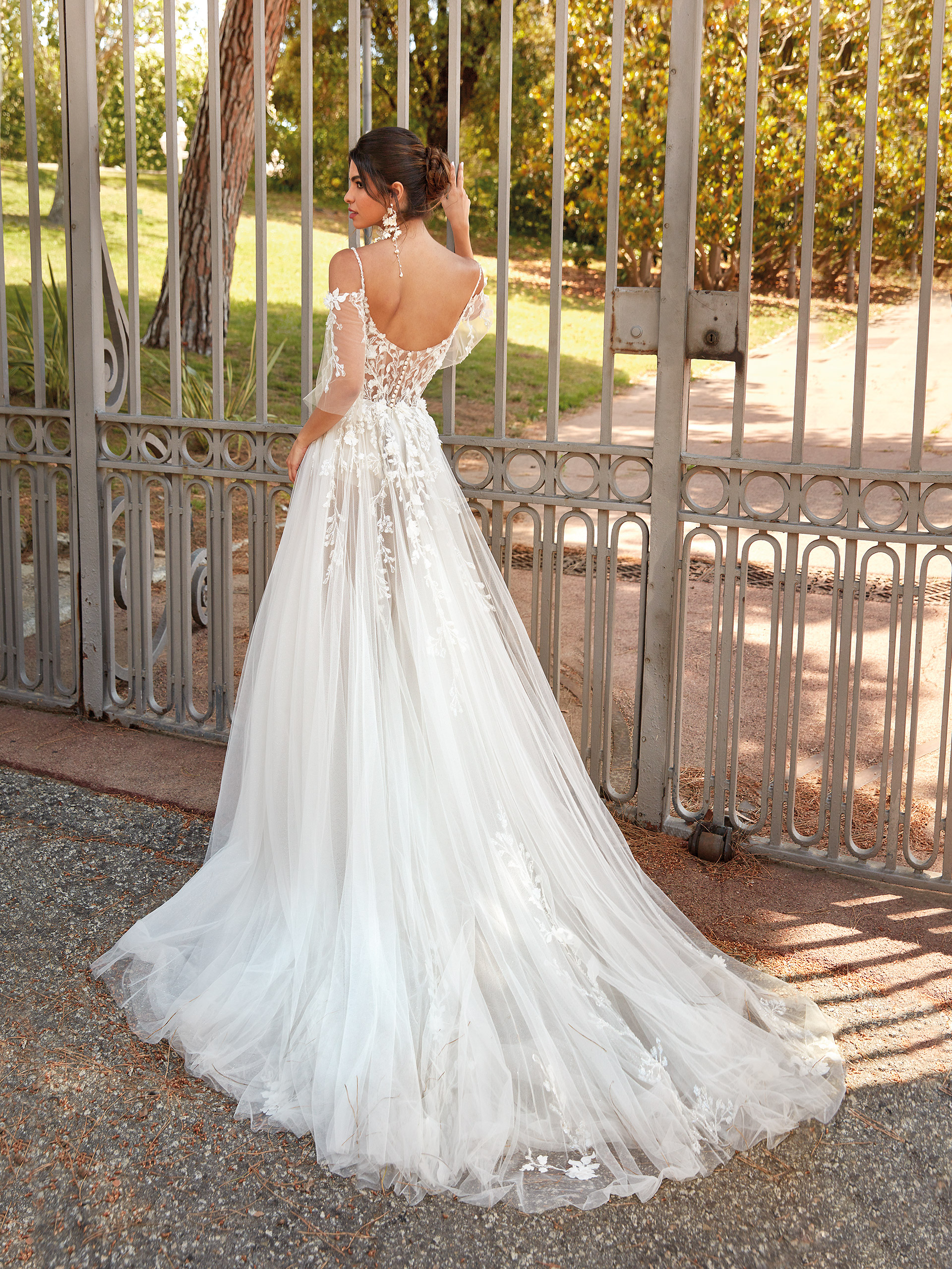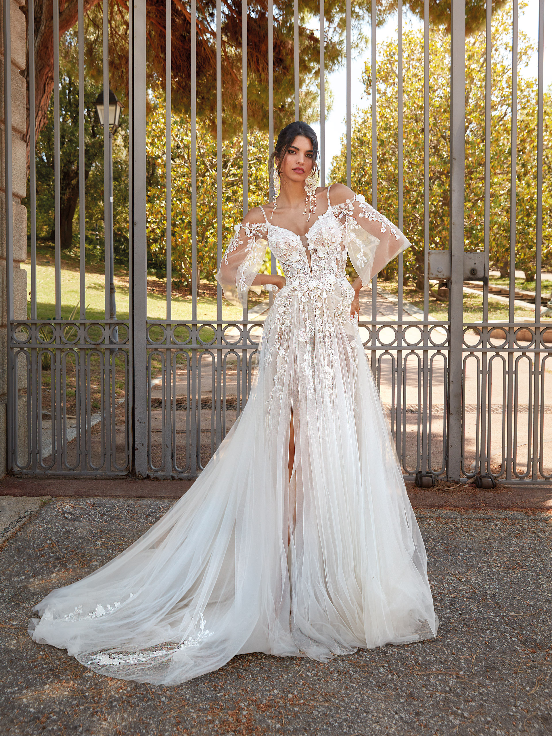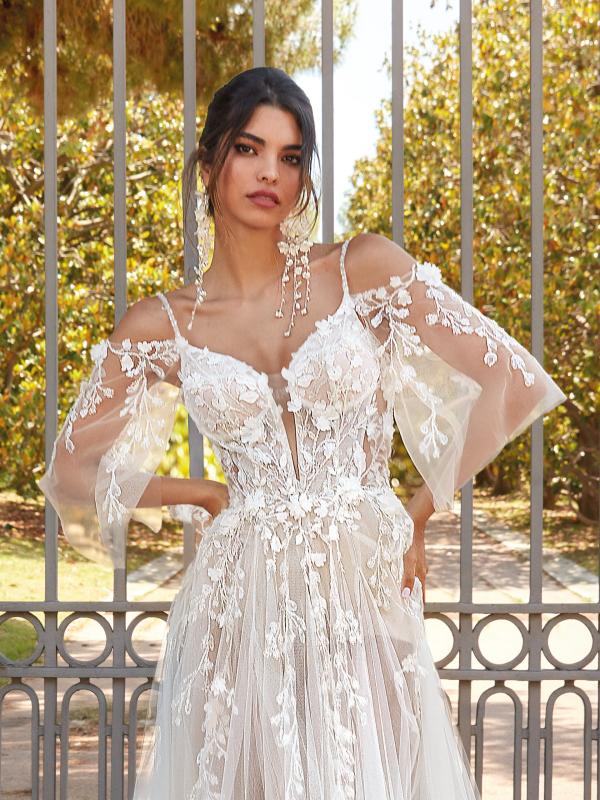 The subtle Esme wedding dress epitomizes romantic lightness and elegance. Made from airy tulle and adorned with matte lace, it captivates with its delicate charm. The spaghetti straps and deep cut-out neckline accentuate the gown`s sensual character. Romantic tulle sleeves add to its allure, while the semi-transparent skirt with a side slit creates an effect of grace and lightness.
