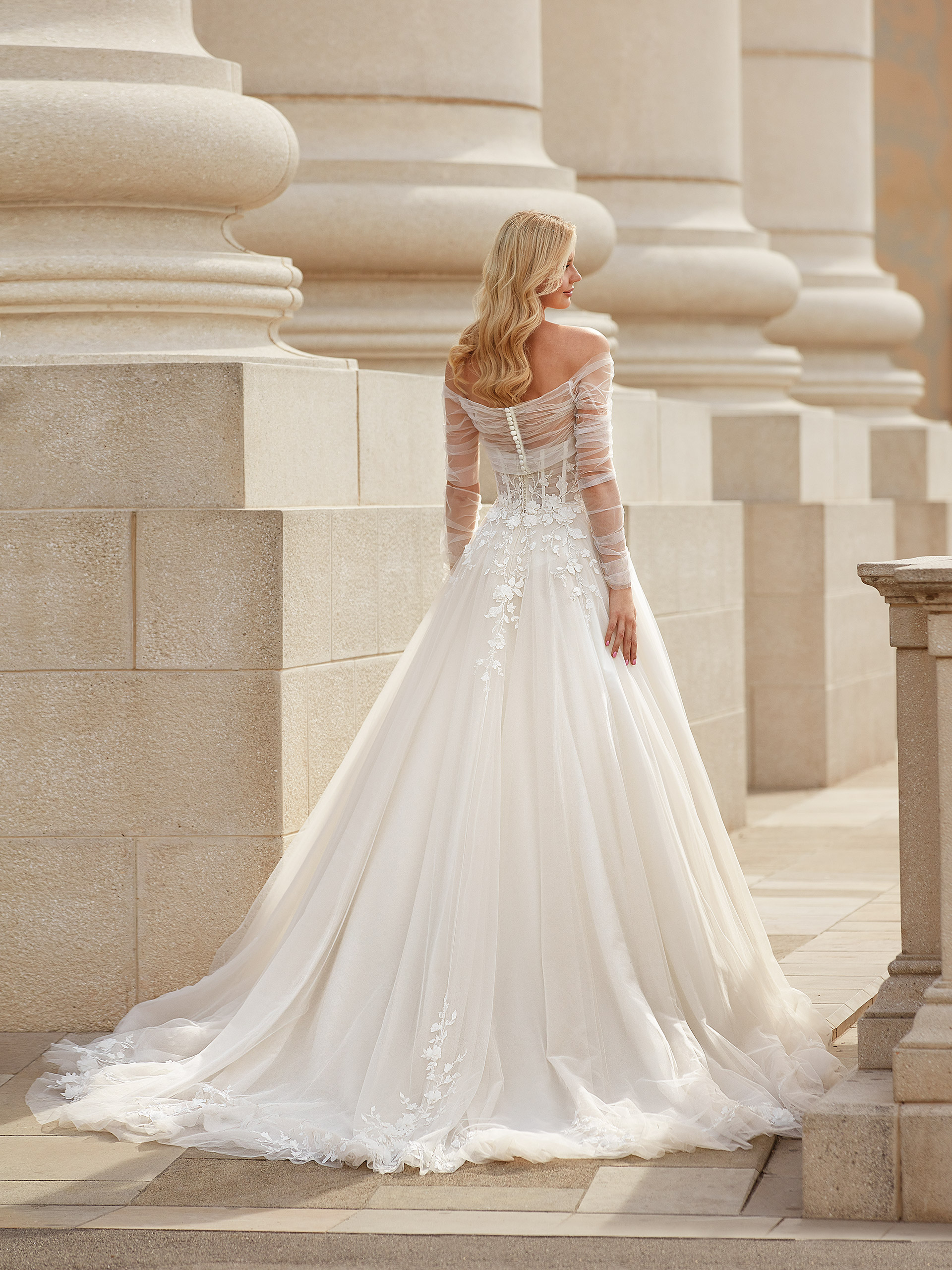 Eva is a romantic wedding gown that enchants with its lightness and subtlety. The airy tulle skirt with a train adds a delicate, ethereal touch to the dress. The semi-sheer bodice with decorative boning accentuates the figure, giving it a refined look. The ensemble is completed with a bolero featuring draping on the neckline and long sleeves, introducing a romantic and elegant accent, perfect for a special day.