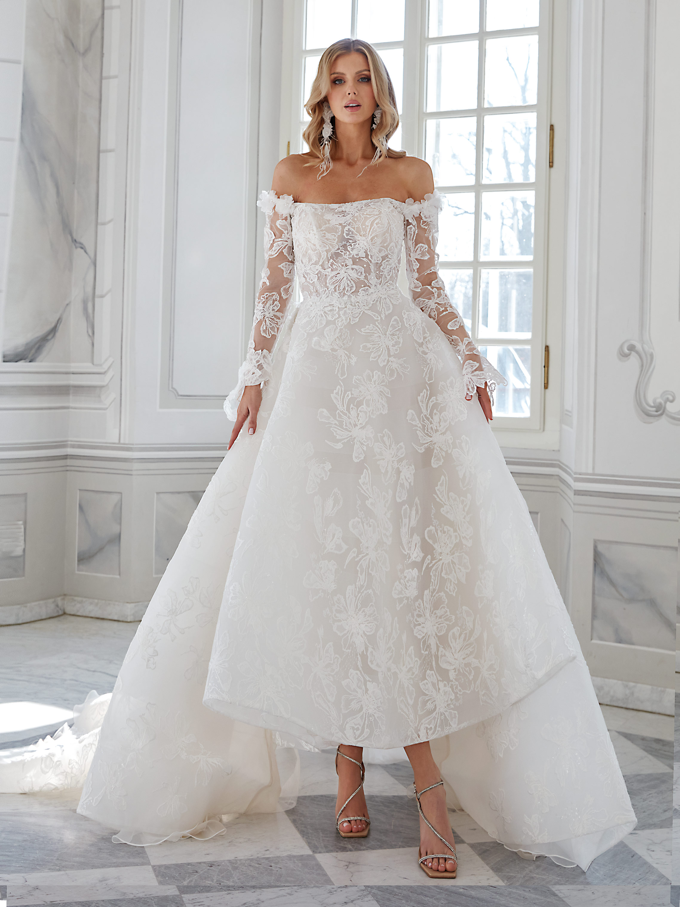 Kalani is a unique wedding dress that captivates with its bold high-low silhouette. The lace bodice with an off-the-shoulder neckline and sheer long sleeves creates a delicate, romantic feel. The front reveals the legs for a daring touch, while the dramatic train at the back adds grandeur and timeless elegance. A perfect choice for a bride who seeks to blend tradition with modern flair.