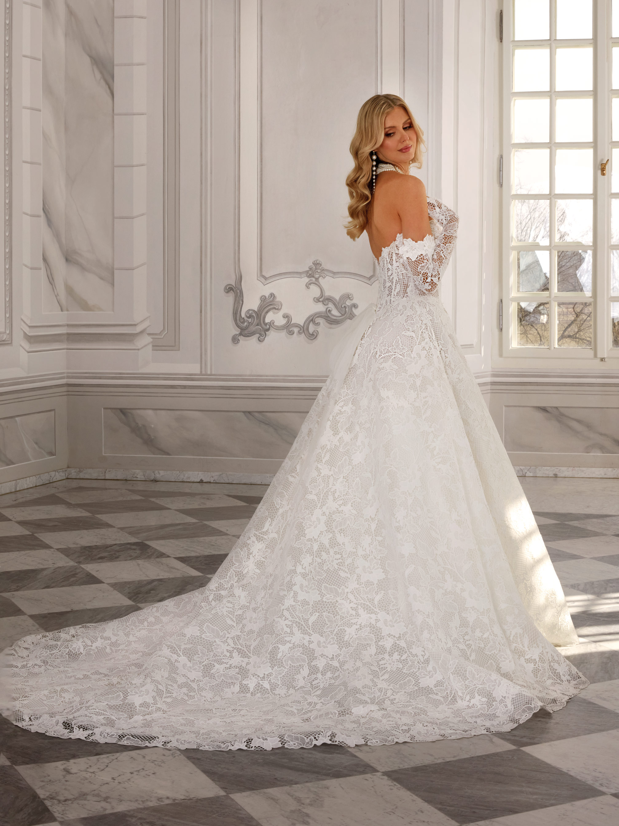 Sensual Kamila is a classic-style gown fully covered in delicate, uniform lace. The sweetheart neckline highlights the figure, while long fitted sleeves add elegance. The neckline is adorned with subtle pearl chains, adding a soft jewelry-like touch. An open back and long lace train complete this chic and romantic look.
