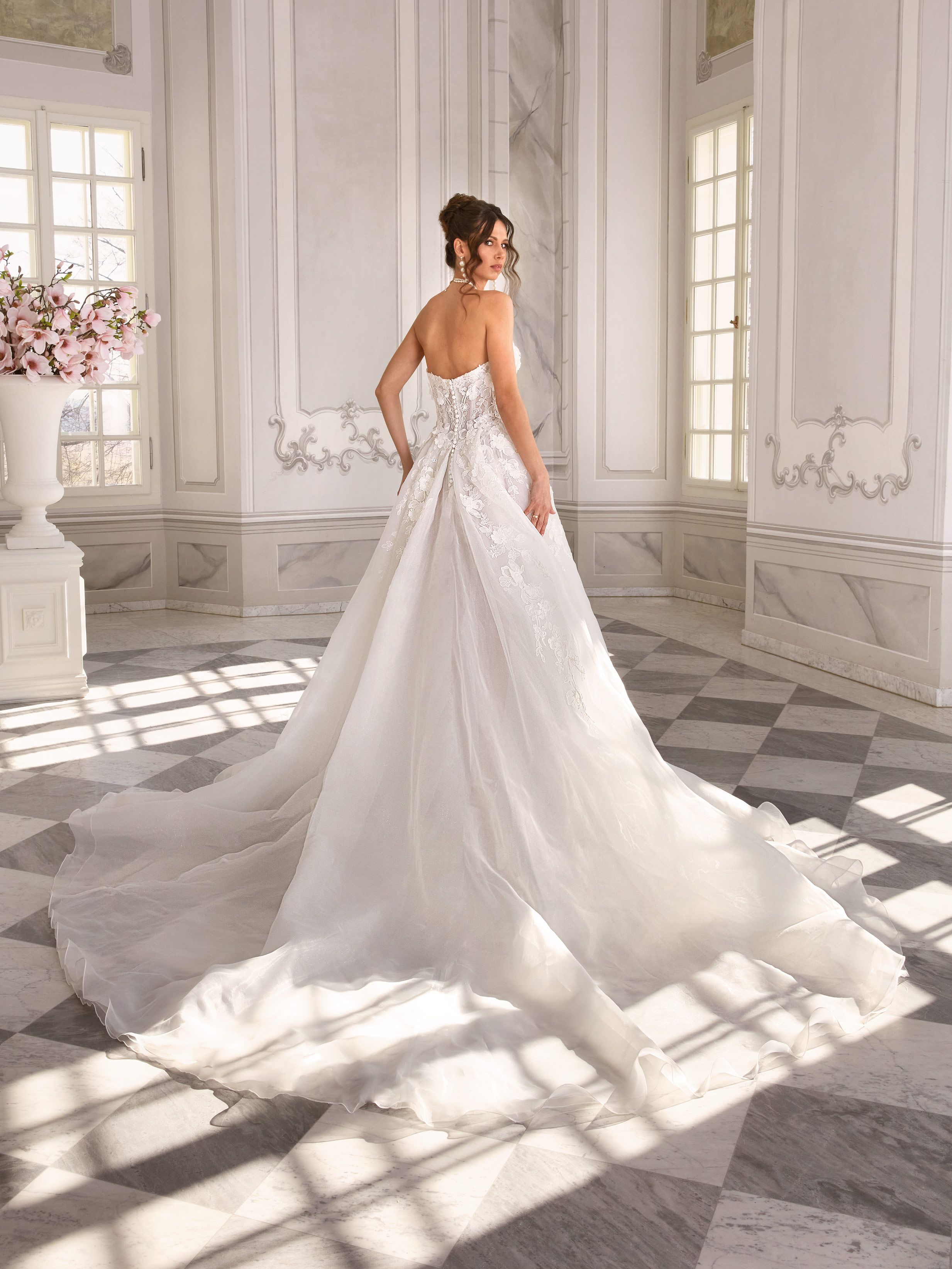 The stunning Kara gown blends sensuality with lightness. A sheer bodice adorned with 3D lace beautifully contours the silhouette. The flowing organza skirt, decorated with lace and a bold leg slit, adds movement and charm. A cathedral-length train completes the look with dramatic elegance.