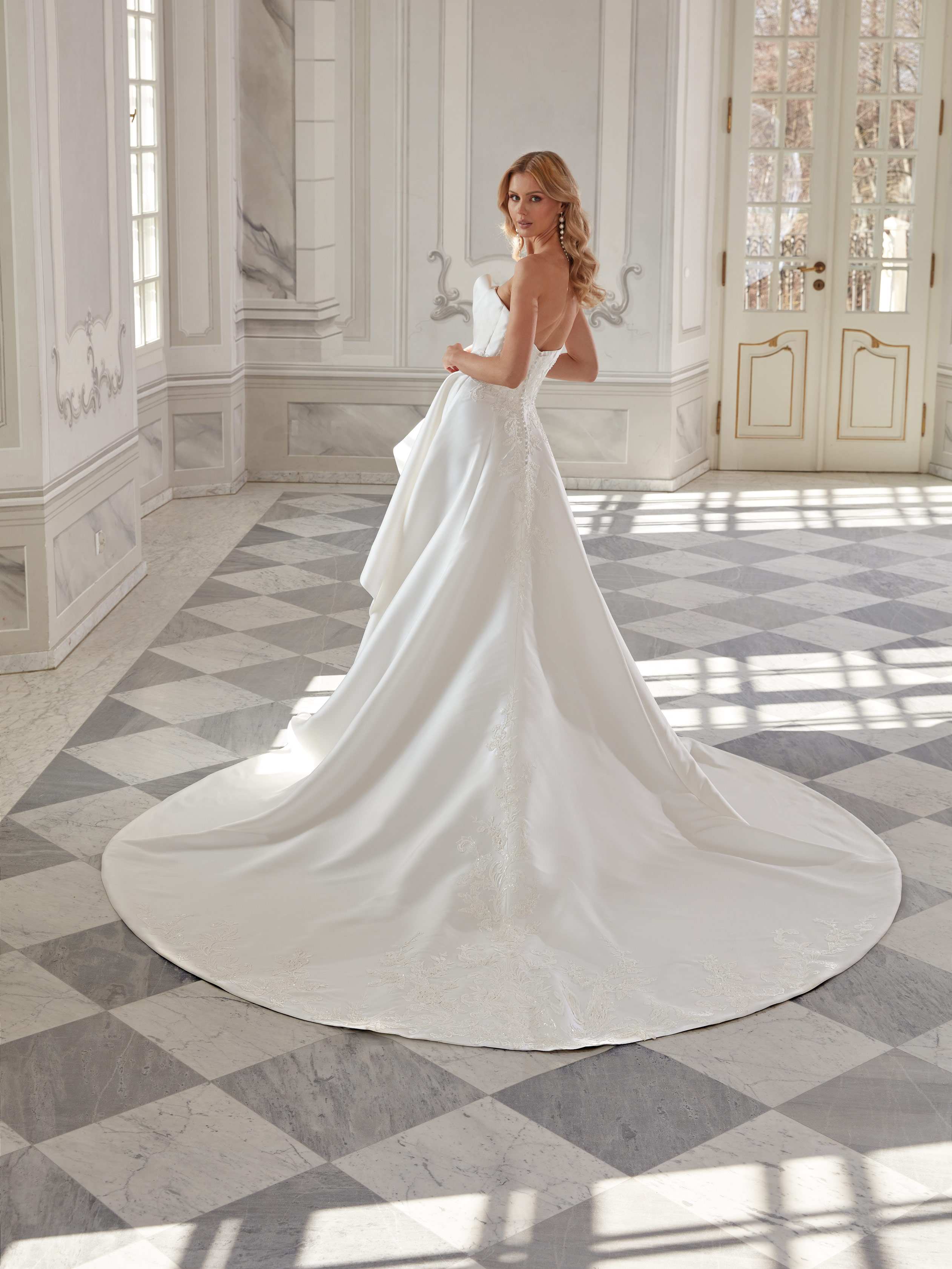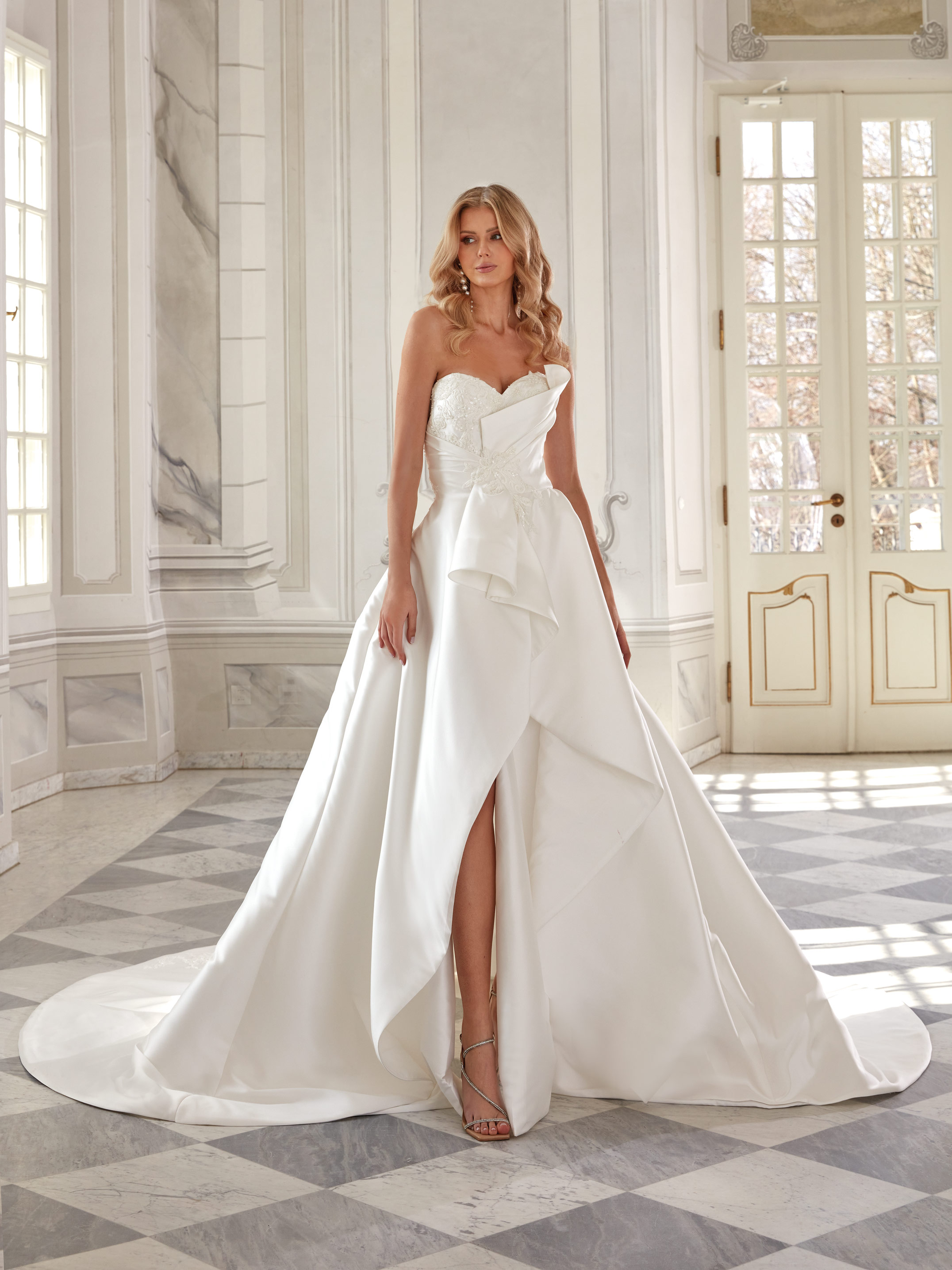 A classic bridal gown with a modern touch – the embroidered bodice with subtle beads pairs beautifully with the layered skirt and bold slit. Made of lustrous fabric, the back features a delicate decorative detail.