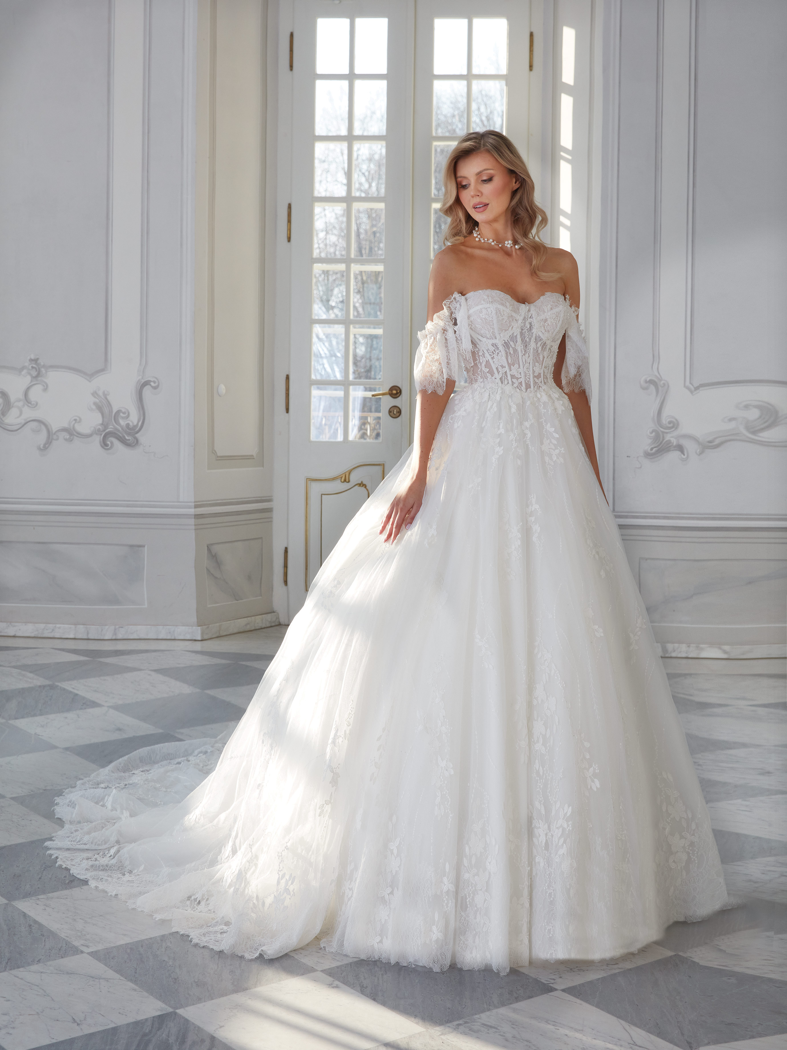 The Karina gown is a beautiful princess-style dress featuring a sheer bodice and delicate, off-the-shoulder lace straps. The skirt layers lace and a subtle shimmer, giving the dress lightness and elegance. The exposed back adds a sensual and modern touch.