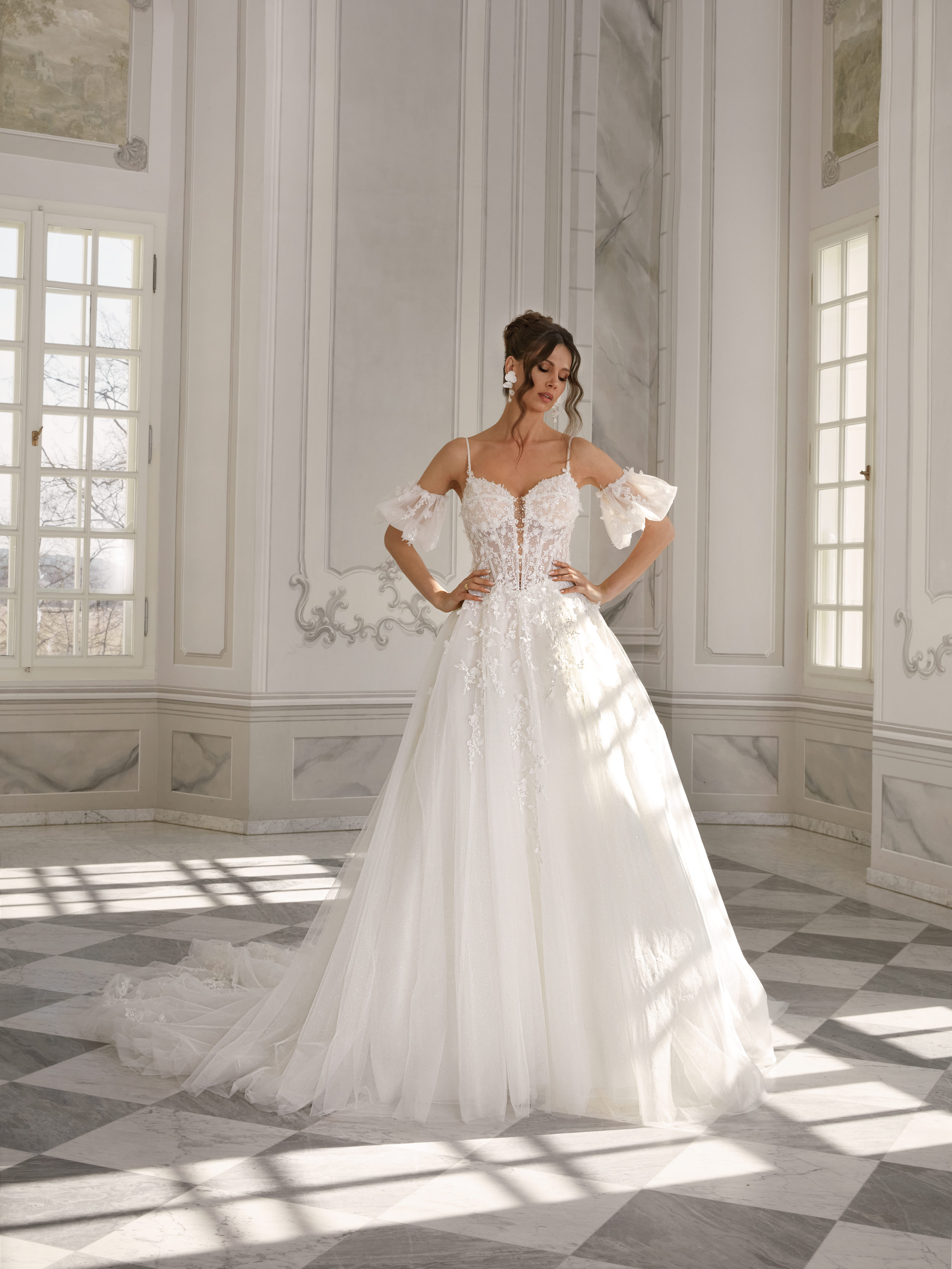 The enchanting Karle gown is a true fairy-tale creation. A delicate lace bodice with a soft plunge neckline and slender spaghetti straps is paired with romantic puff sleeves adorned in lace. The glittering skirt sparkles with every step, flowing into a majestic cathedral train that completes this dreamy bridal look.