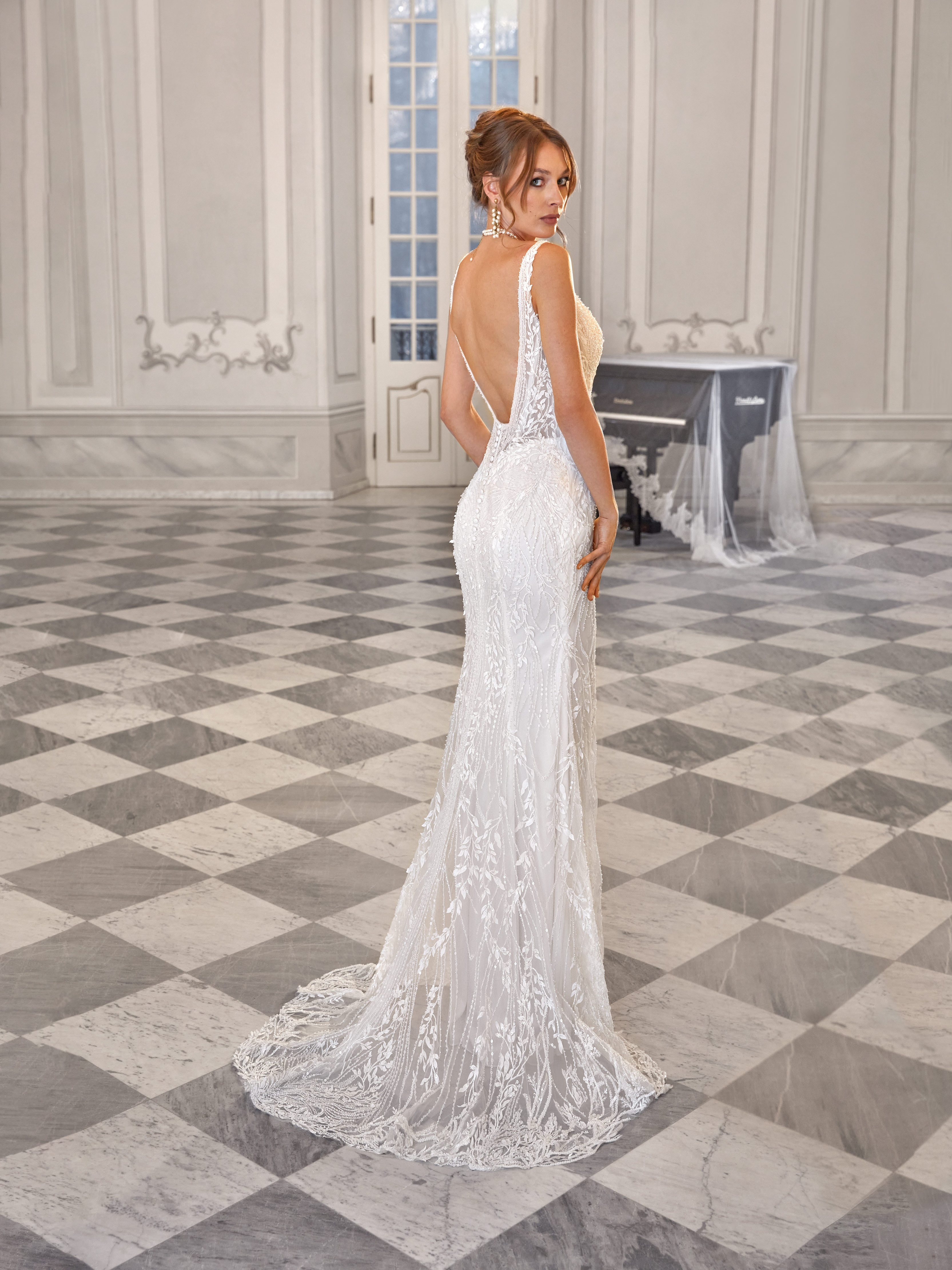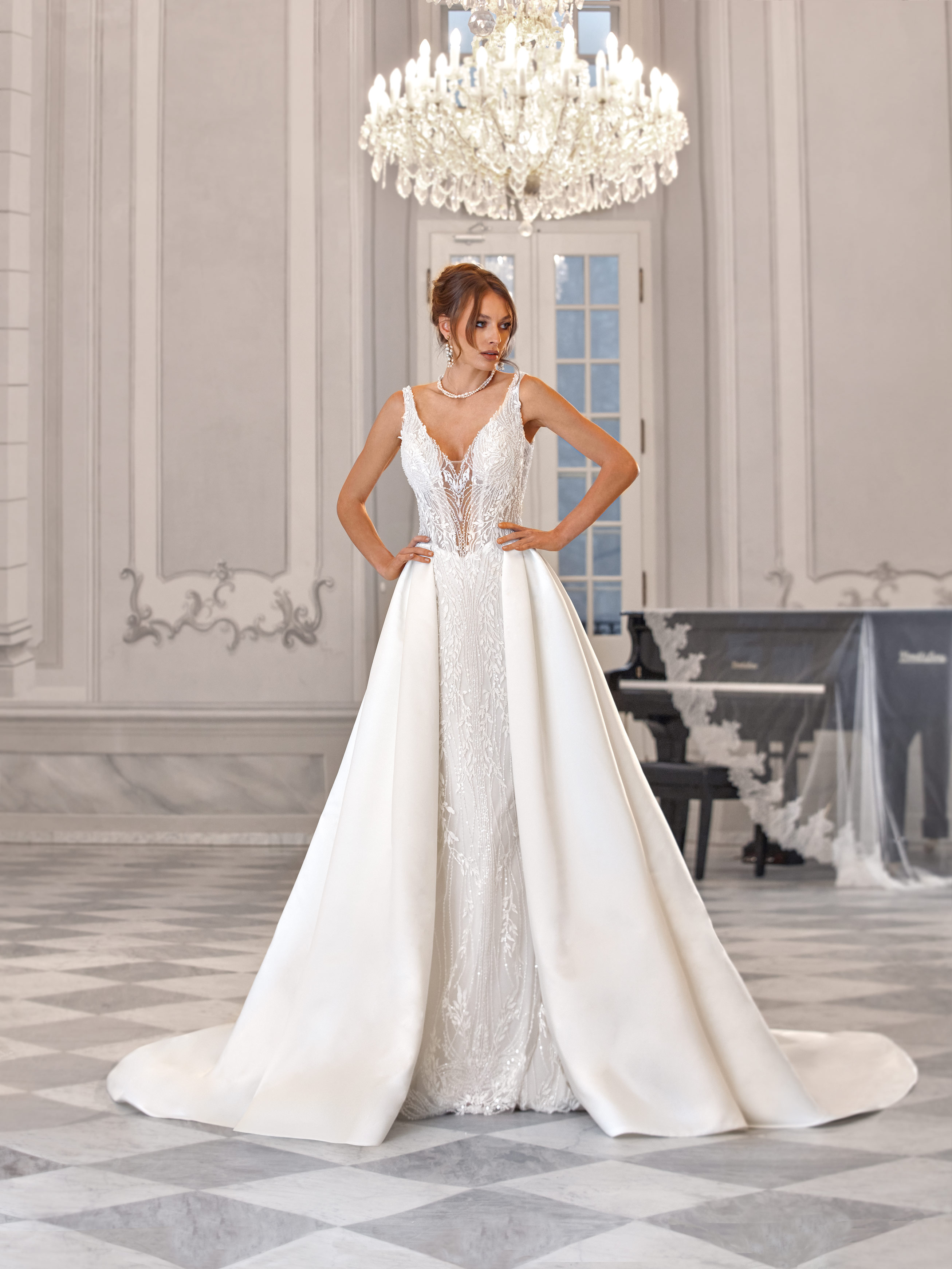 Katarina is a refined fitted gown made of richly embroidered fabric with a subtle shimmer. The deep neckline with a sheer insert and softly transparent sides enhance the figure. The look is completed by a detachable full skirt with a train, adding a touch of grandeur.