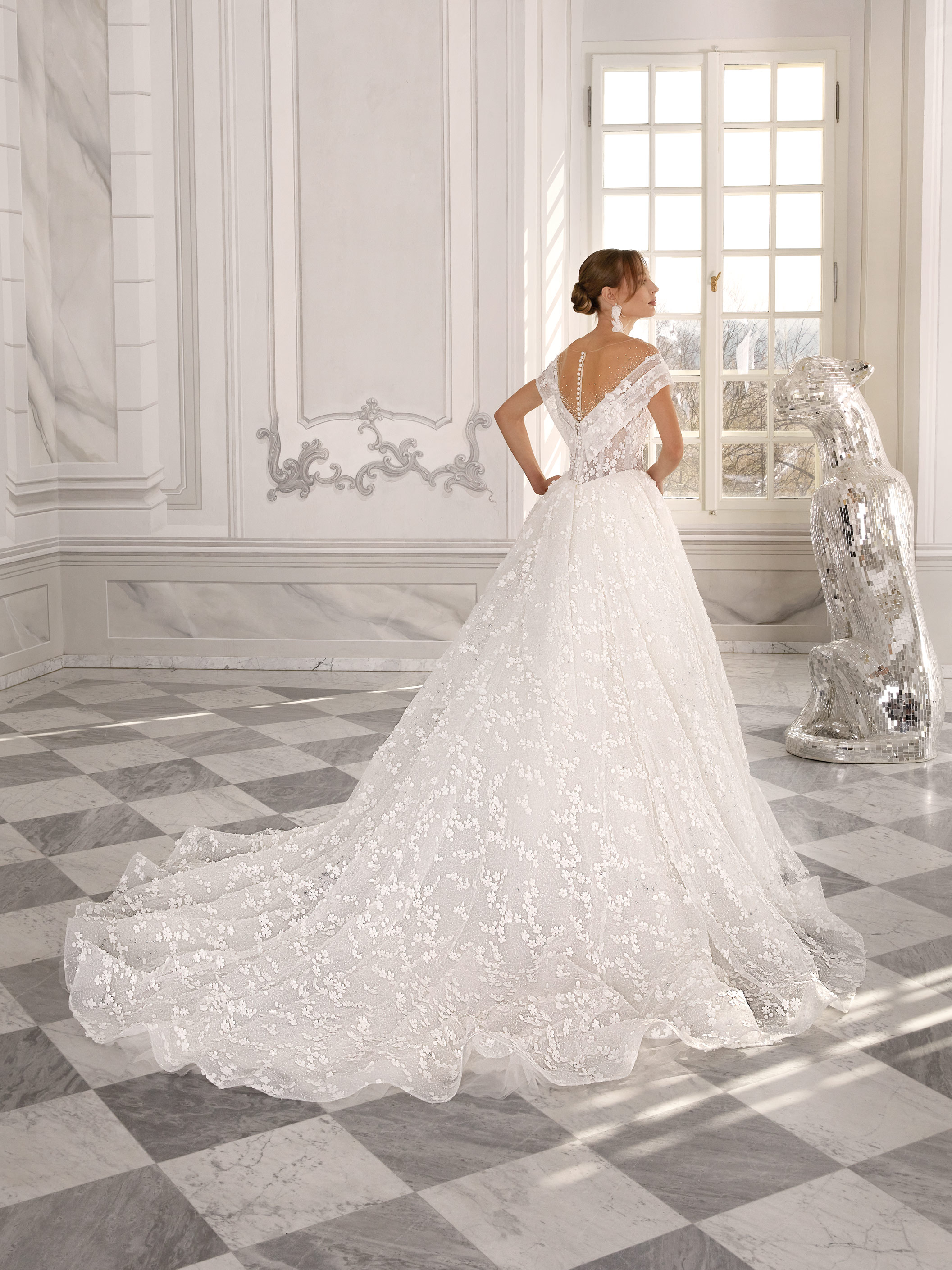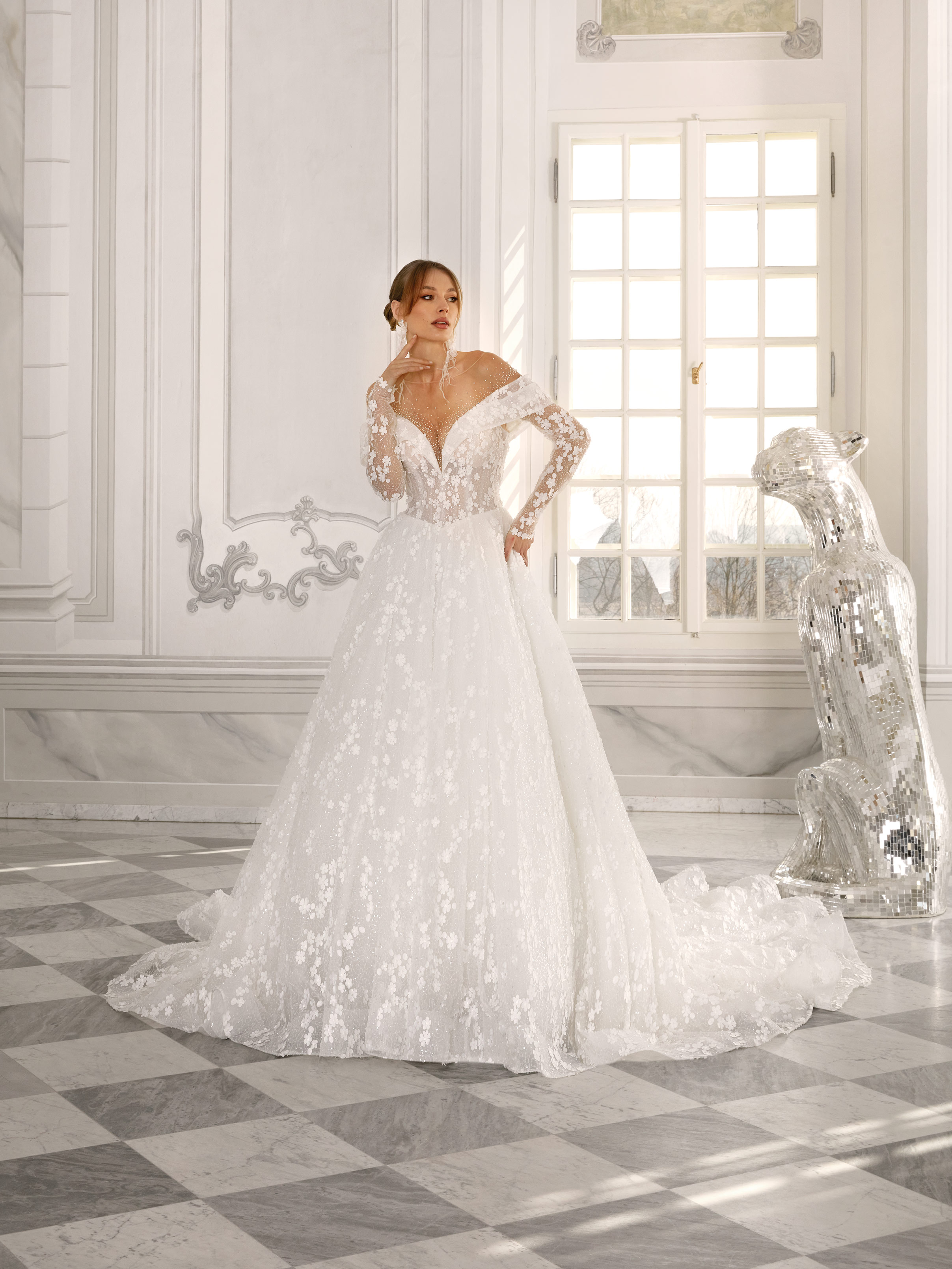 The dazzling Kayla is a voluminous gown with a stunning train, made from fine lace with a subtle shimmer that adds magic and a unique character. The long-sleeved bodice is intricately decorated with stones, highlighting the elegance and luxury of the entire dress. It’s the perfect choice for a bride who wants to shine on her big day.