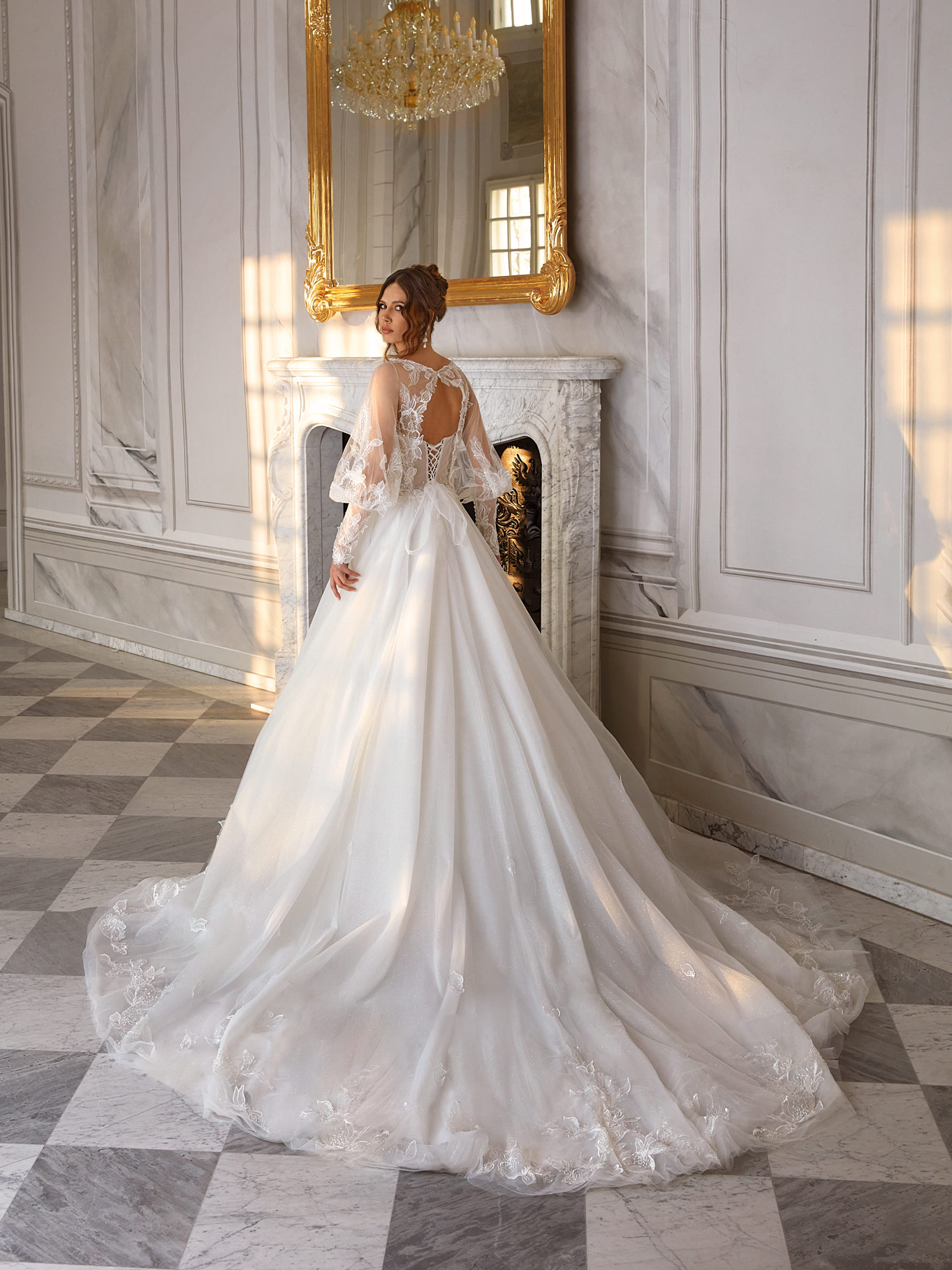 The elegant Kelsey princess gown captivates with floral lace adorned with sequins, adding sparkle and delicate refinement. It is complemented by a bolero with puffed sleeves decorated with lace and lace cuffs for a chic touch. The figure is accentuated by a lace-up bodice, and the cathedral train gives the entire dress a royal flair.