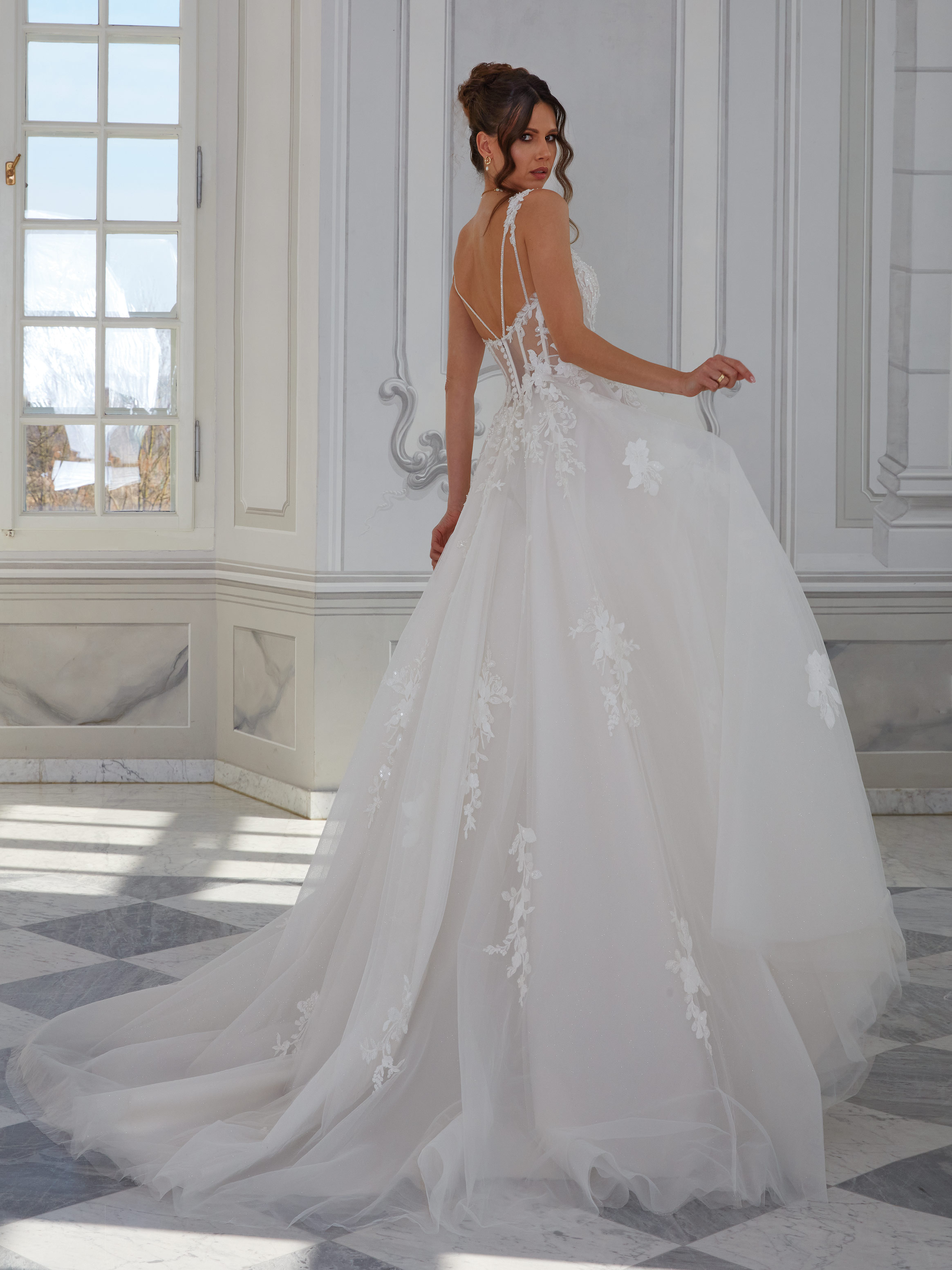 Delicate Kenna is a princess-cut gown that captivates with lightness and romance. The sheer bodice with visible boning features double thin straps, adding a modern touch. The transparent back is finished with fine lace, creating a sensual yet elegant detail. A soft, flowing train completes this graceful bridal look.
