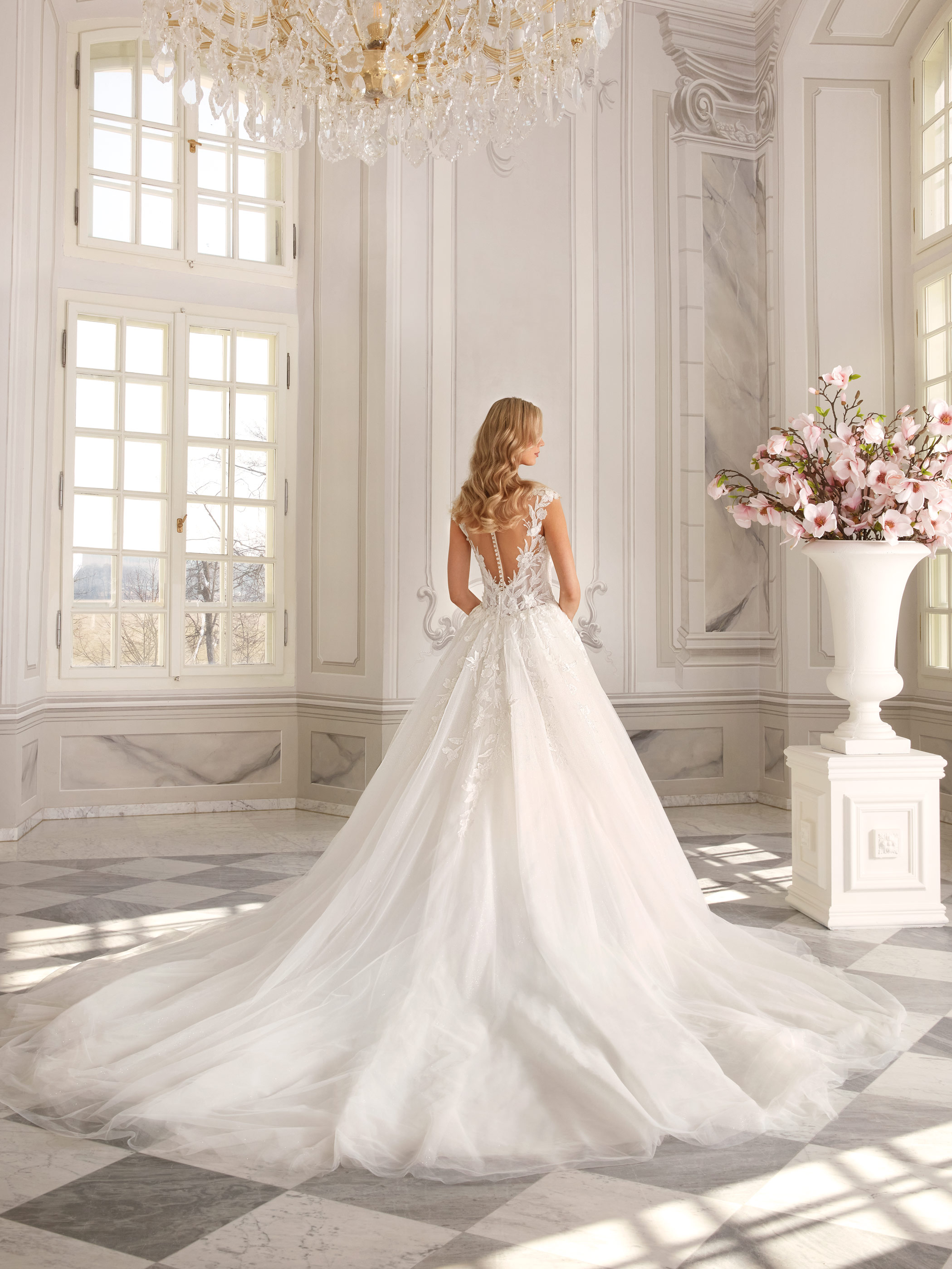 Enchanting Kimber is a romantic princess-cut gown with a glittery tulle skirt that shimmers with every step. The bodice features a soft plunge neckline and short off-the-shoulder sleeves, gracefully framing the shoulders. Decorative buttons and subtly open back add elegance and charm.