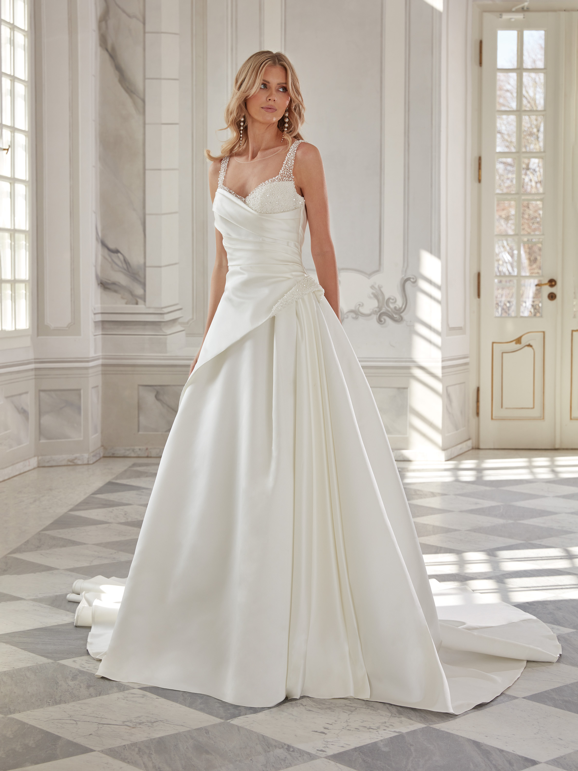 An elegant bridal gown Kimberly featuring a deep open back framed with delicate lace and a row of decorative buttons. The structured bodice highlights the waist, while the smooth skirt and sweeping train add grace and sophistication. Lace details gently accent the straps and backline.