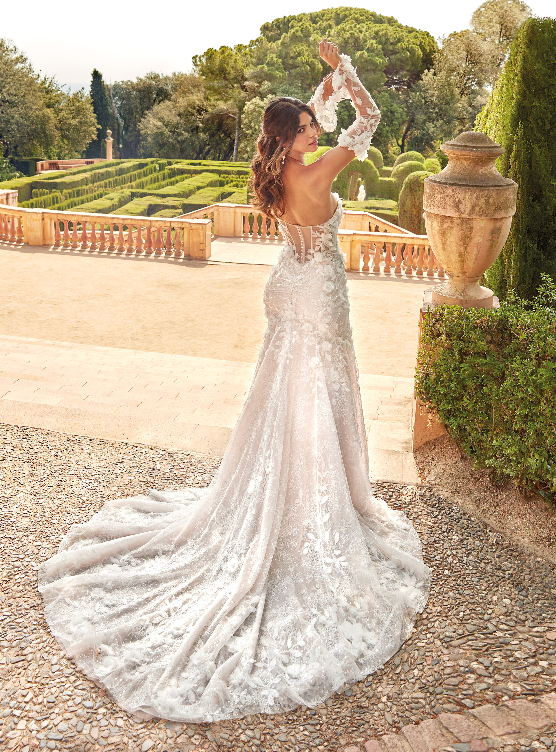 The romantic Lara wedding dress is a unique creation that combines two types of lace – French lace and original lace with three-dimensional elements. The dress features a deep neckline and long sleeves that highlight the shoulders. The exposed back with decorative buttons adds elegance, while the lace-covered train completes the look, creating an unforgettable effect.