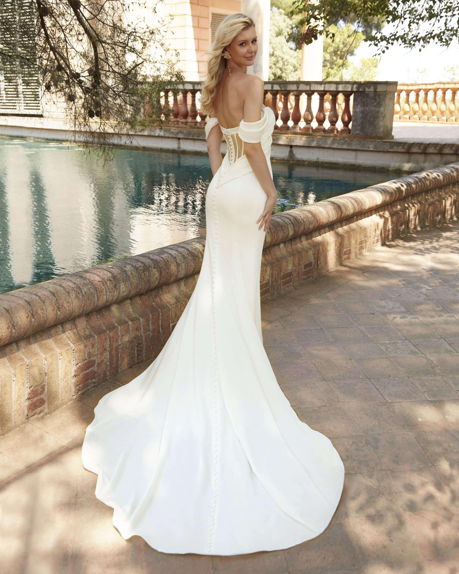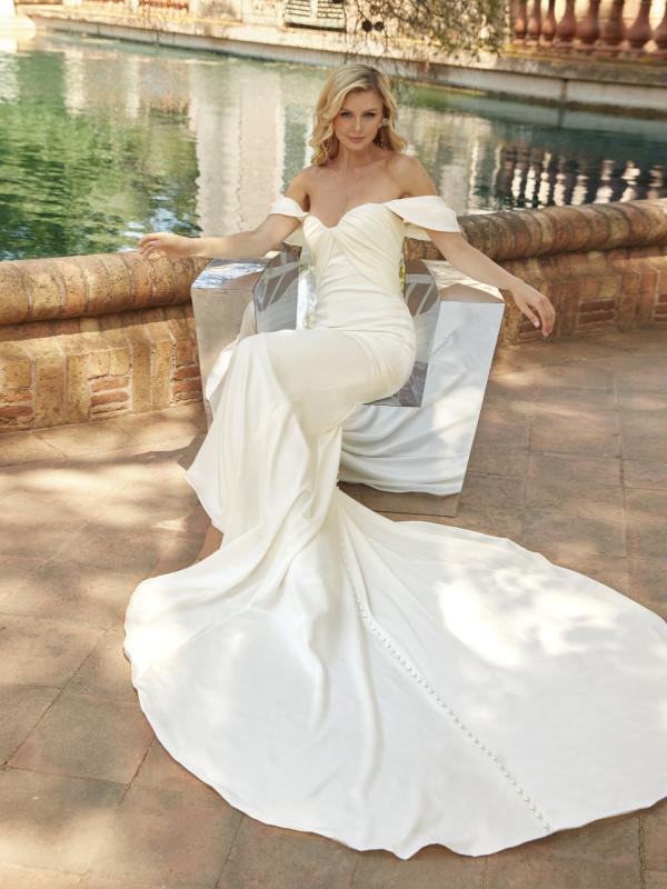 The Lena wedding dress in a mermaid silhouette perfectly combines classic and sophistication. It features a unique sweetheart neckline with delicate pleats and off-the-shoulder straps, subtly highlighting the shoulders. The dress is crafted from elegant Mikado fabric, ensuring a smooth and luxurious appearance. The long, sleek skirt flows into a majestic cathedral train, adding a regal touch to the gown.