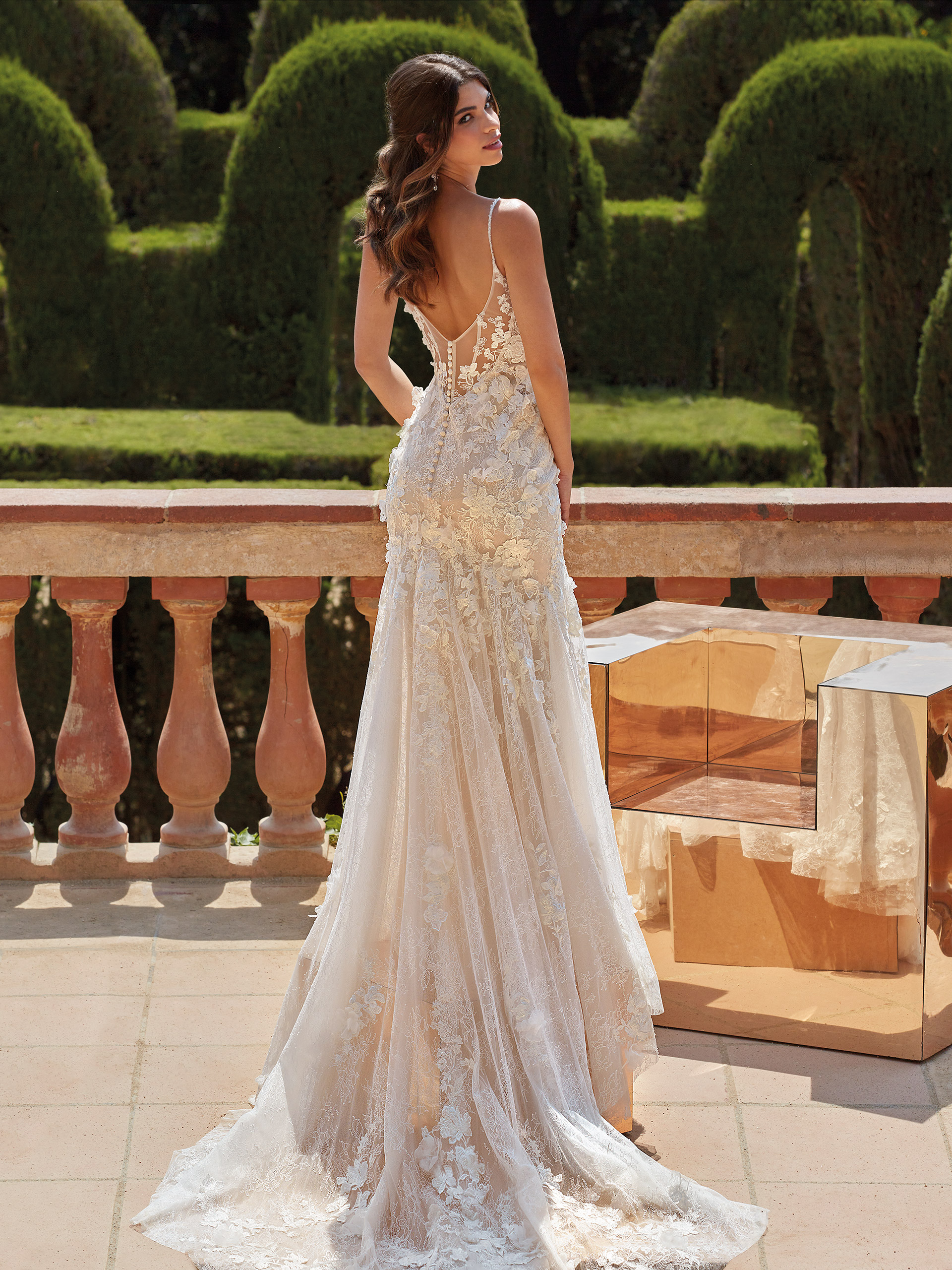 Leonora is a fitted wedding gown that exudes subtle elegance and modern charm. The lace neckline