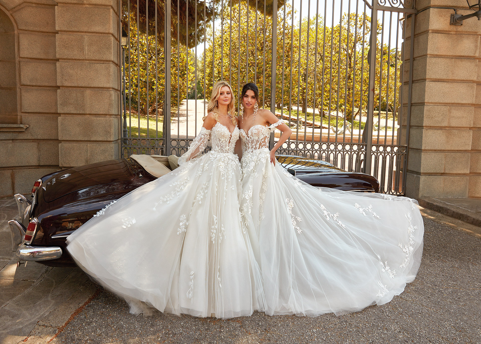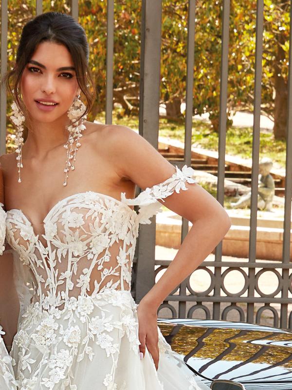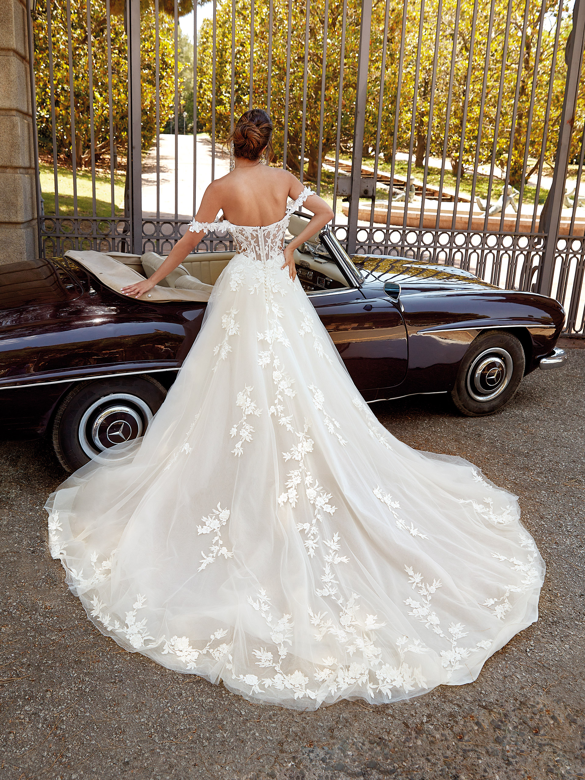 Lila is a royal wedding gown that exudes elegance and sophistication. The transparent bodice, intricately covered in lace, accentuates the figure, while delicate straps gently reveal the shoulders, adding a touch of sensual charm. The dress features a convenient zipper closure for a perfect fit. The ensemble is completed with a long cathedral train that flows majestically behind the bride, creating a breathtaking effect.
