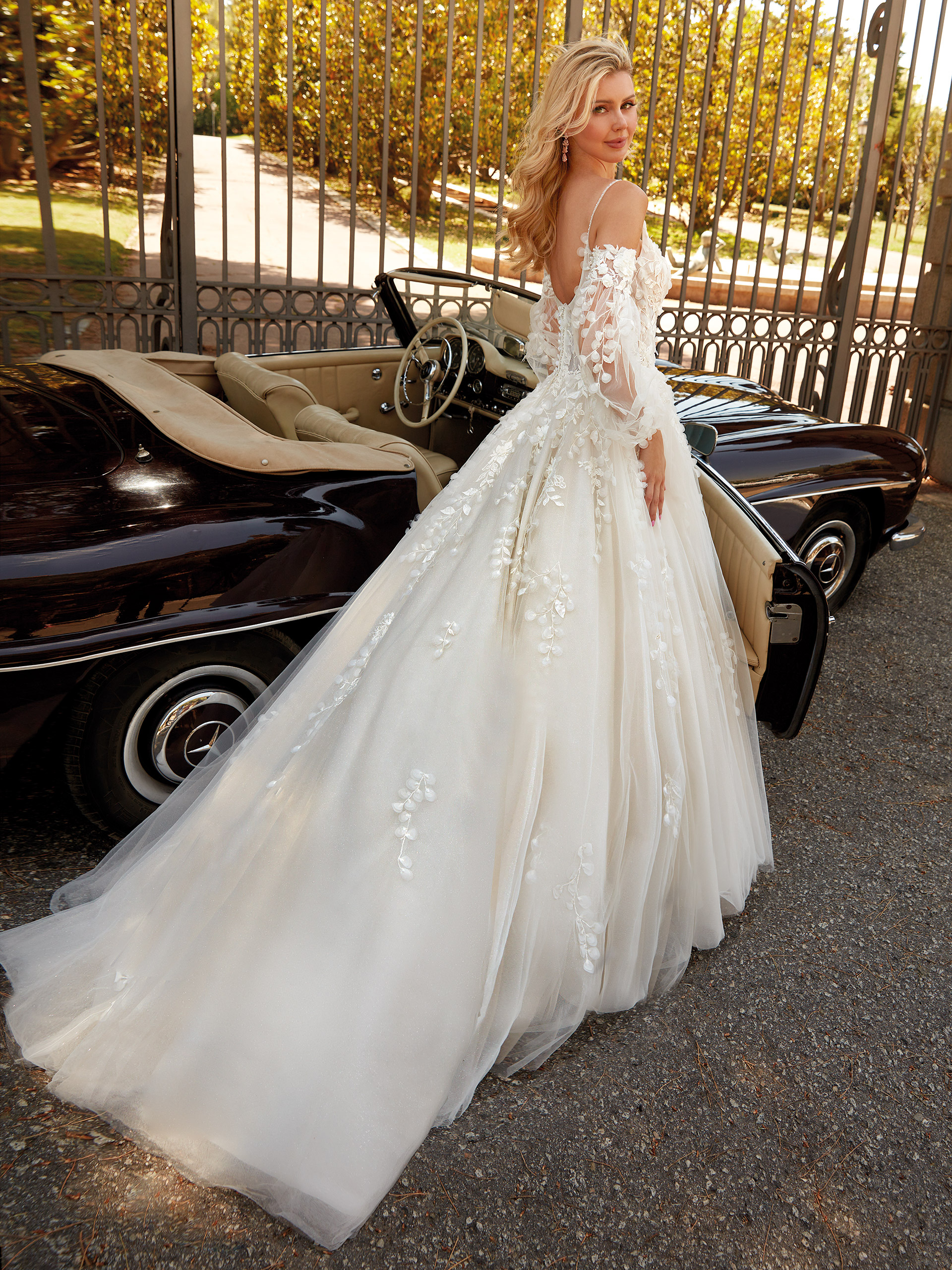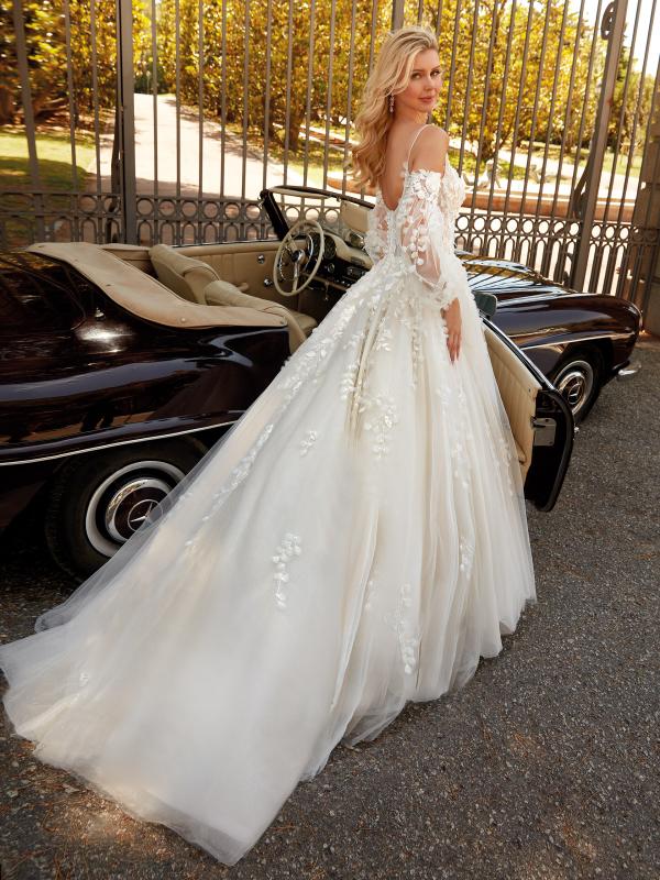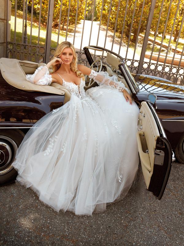 Lillian is a majestic wedding gown that blends classic elegance with modern details. The bodice features a deep V-neckline, intricately covered in lace, subtly accentuating the figure, while delicate straps add a touch of sophistication. The dress fastens with a zipper, and the back is adorned with decorative buttons, introducing a gentle, vintage-inspired element. Airy tulle sleeves with lace cuffs give the gown a romantic flair. The long skirt with a train, covered in lace with 3D elements, creates a stunning effect with every step.