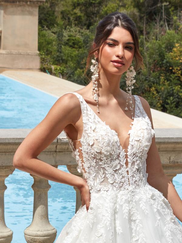 Lucia is a royal wedding gown that exudes elegance and sophistication. The wide straps and V-shaped neckline accentuate the neckline and shoulders, giving the dress a classic yet sensual appearance. Side cutouts and an open back add a touch of subtle allure while maintaining its majestic character. The long skirt with a train flows gracefully, creating an elegant and striking effect, perfect for a royal wedding.