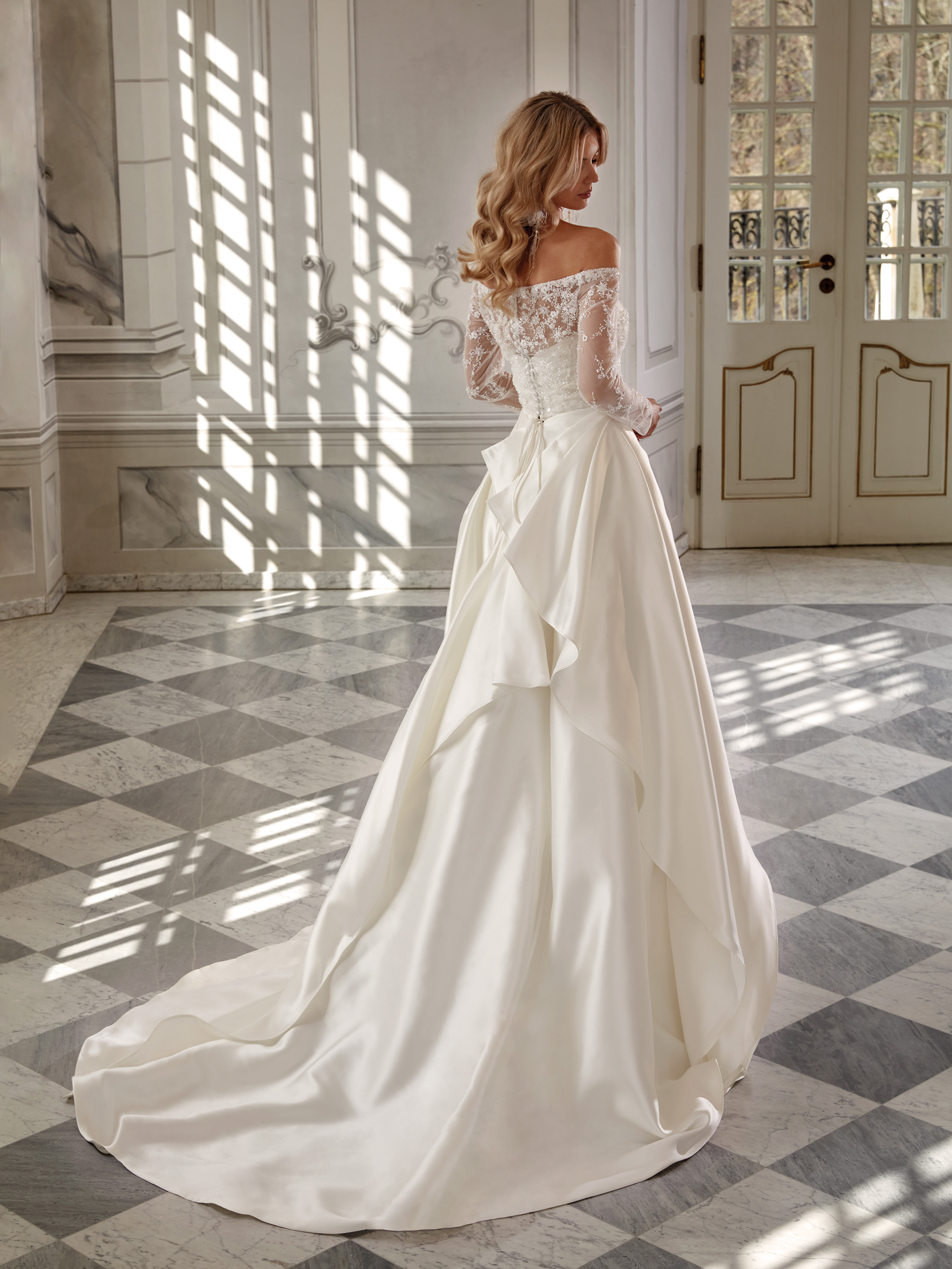 Crafted from luxurious satin, this gown features a structured bodice with sculpted pleats and a heart-shaped neckline. A high front slit reveals the leg for a modern touch. The back flows into a softly cascading train. A lace bolero with long sleeves completes the look with a romantic and refined finish.