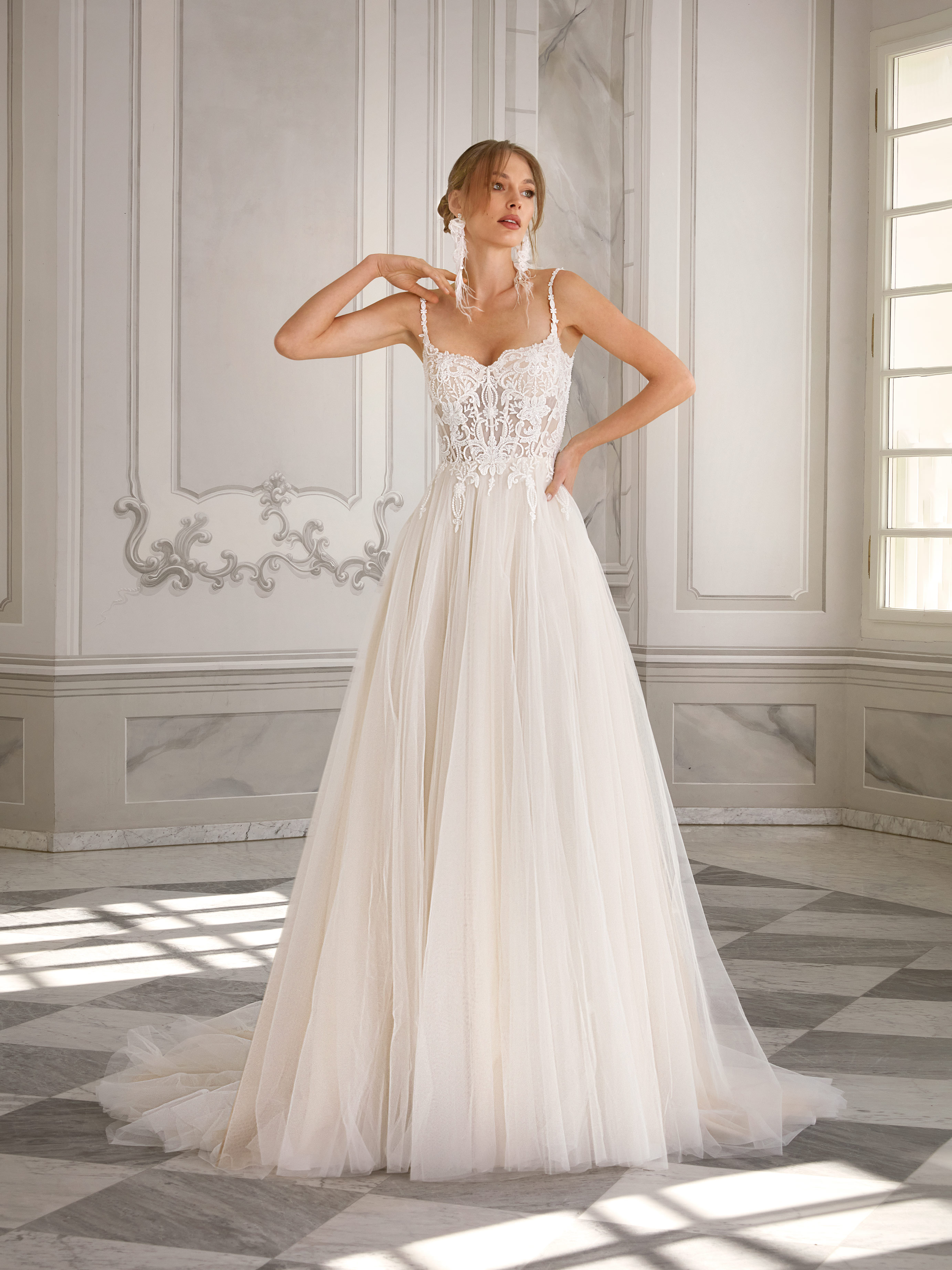 Natta is a romantic wedding gown with a light, ethereal feel. The delicate bodice, crafted from sheer lace and thin spaghetti straps, softly highlights the neckline and open back. The skirt flows in airy layers of soft tulle, creating a graceful and effortless silhouette. Classic in shape but rich in charm, Natta is perfect for the bride who seeks natural beauty and understated elegance.