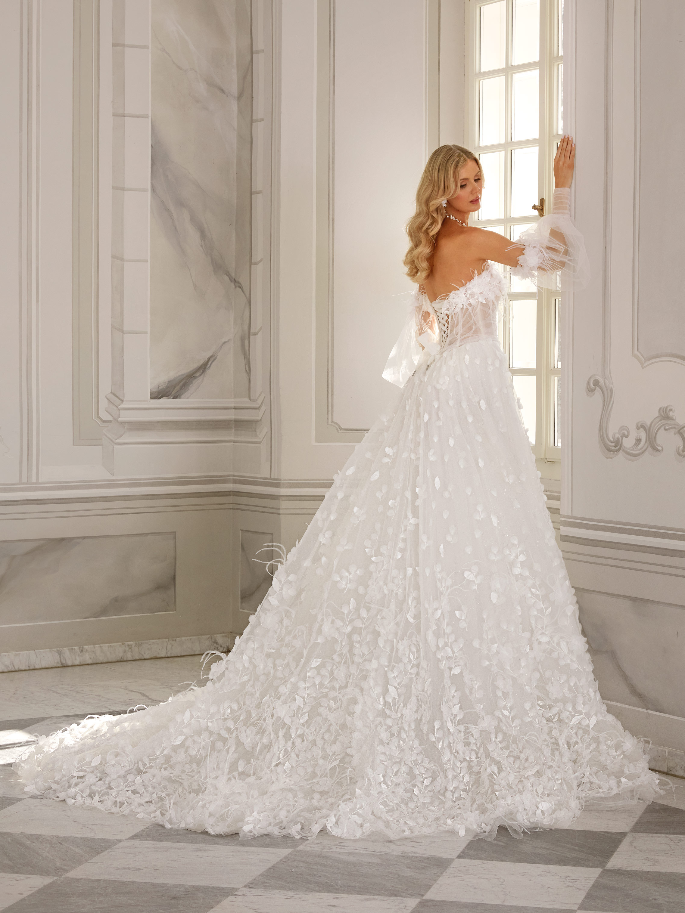 Nella is a fairytale wedding gown designed for the bride dreaming of a show-stopping entrance. The sheer bodice with a soft sweetheart neckline is adorned with lace appliqués and delicate ruching. Dramatic puffed organza sleeves bring a touch of theatrical charm. A long skirt with a slit and a richly embellished train make for an unforgettable silhouette. Intricate 3D leaf-like lace details give the gown depth and an enchanting finish.