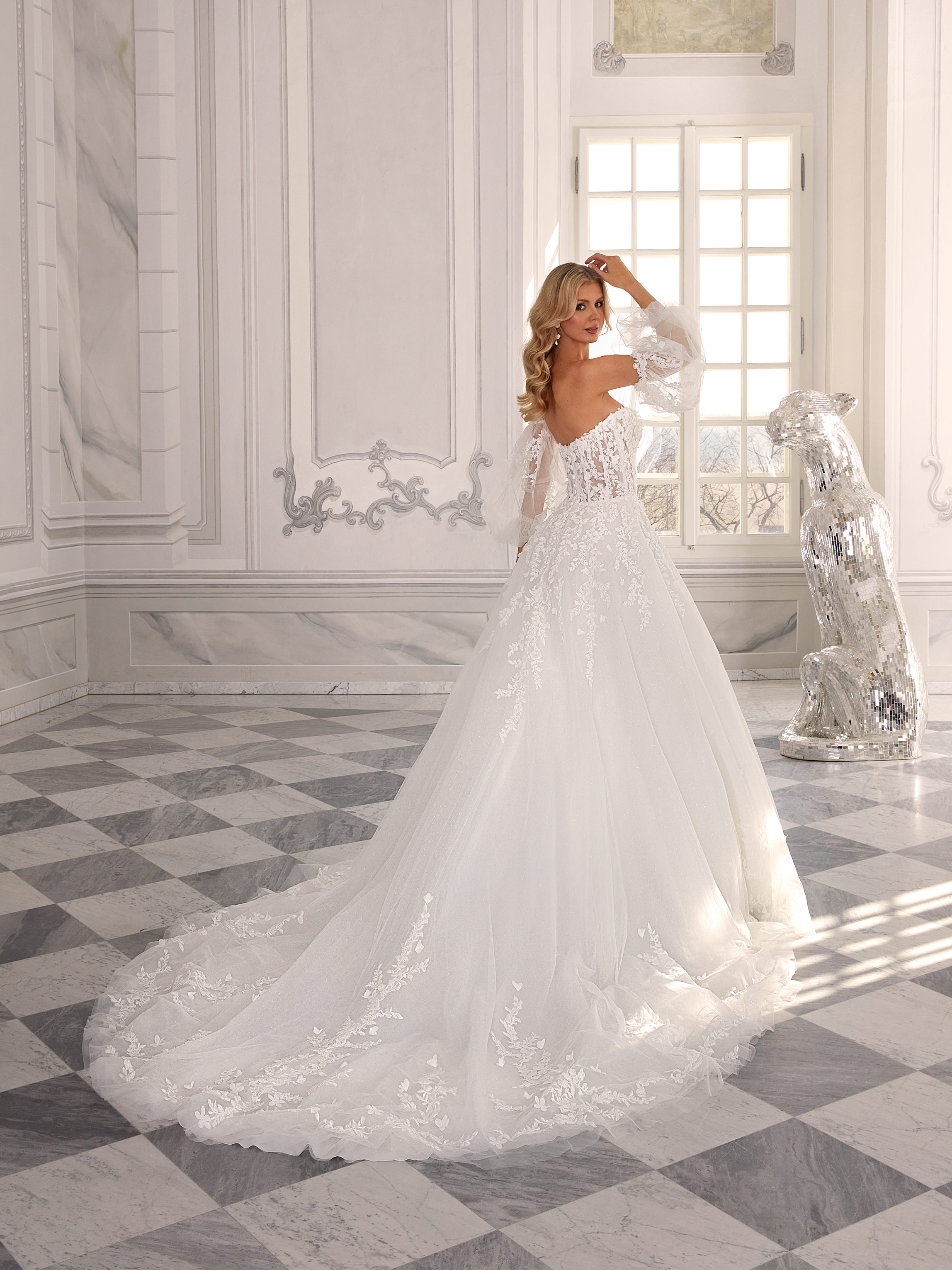 The Nia 2680 gown features a romantic tulle skirt with a train. The structured bodice with visible boning and a deep sweetheart neckline is adorned with 3D floral appliqués. Sheer, airy sleeves complete the soft and dreamy look.