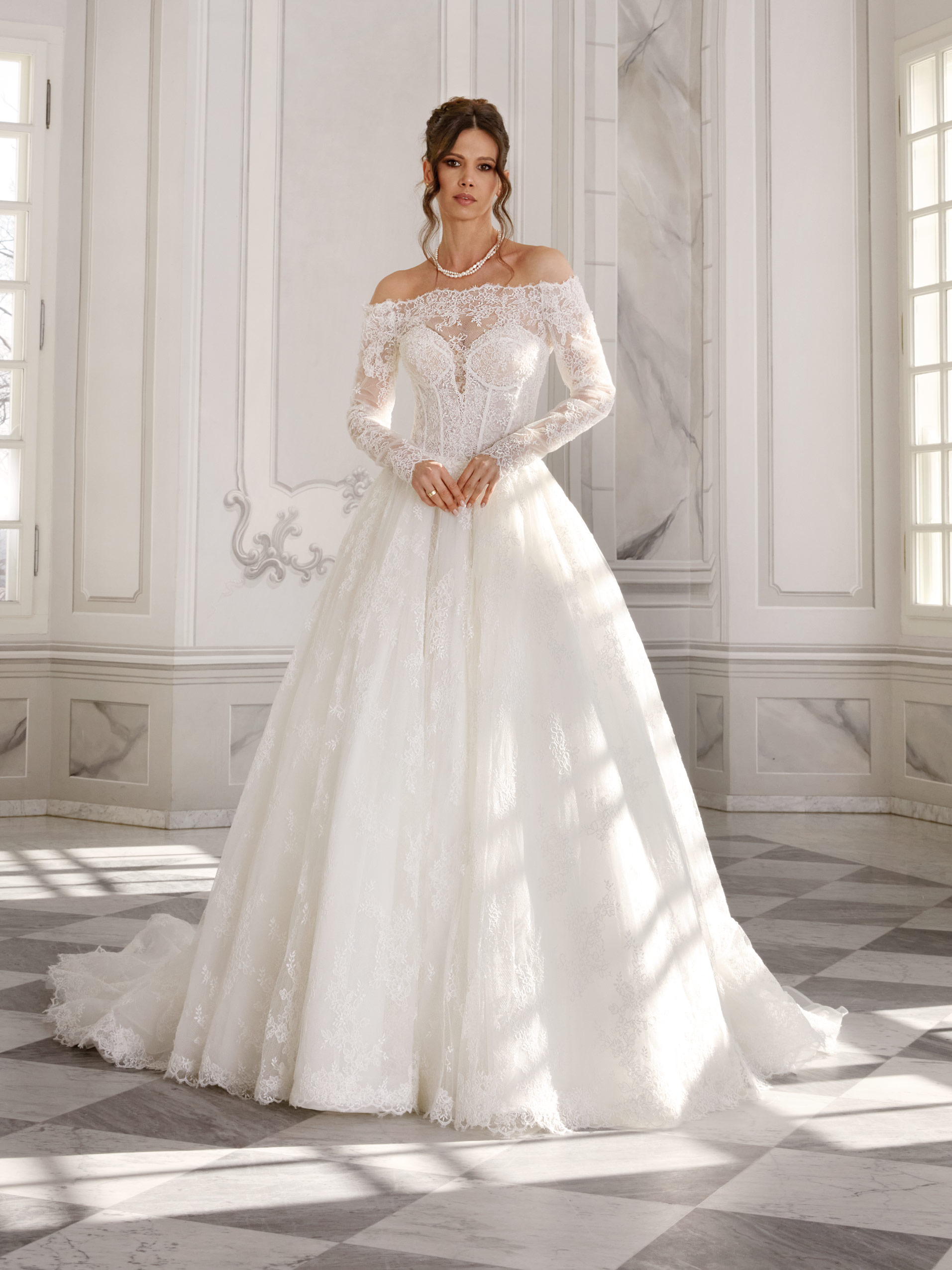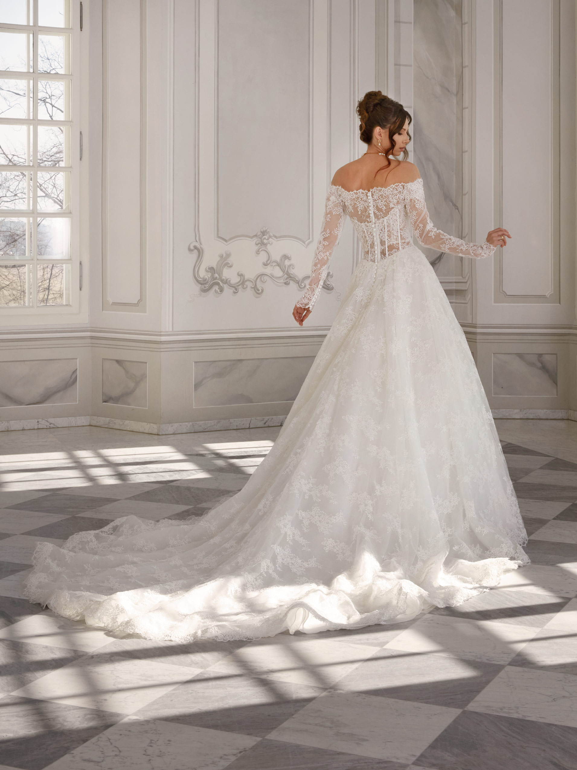 A romantic princess-style wedding dress made of delicate lace. The off-the-shoulder bodice with sheer details highlights the figure beautifully. It comes with a detachable long-sleeve bolero, perfect for the ceremony. The full skirt ends with an elegant train.