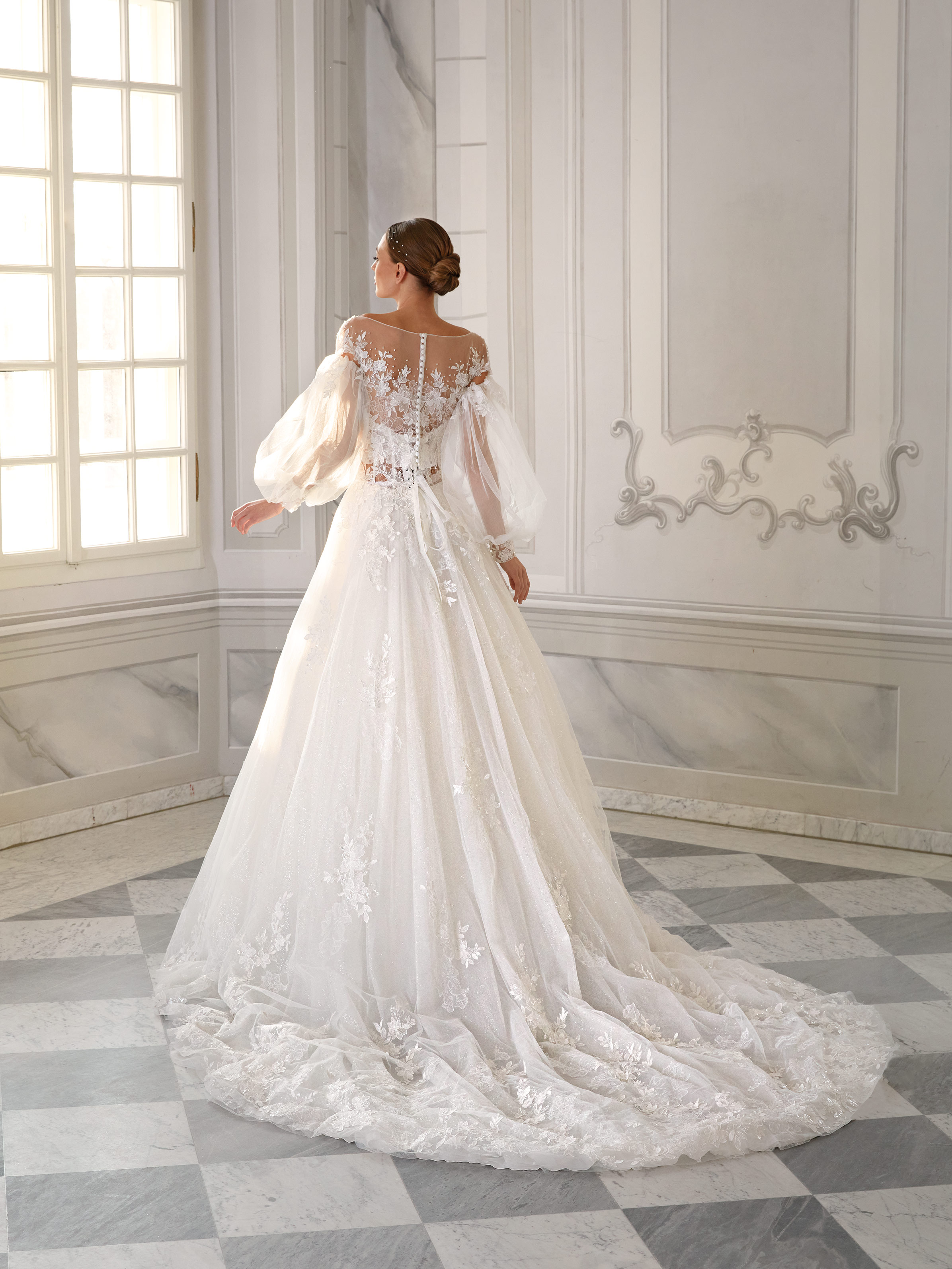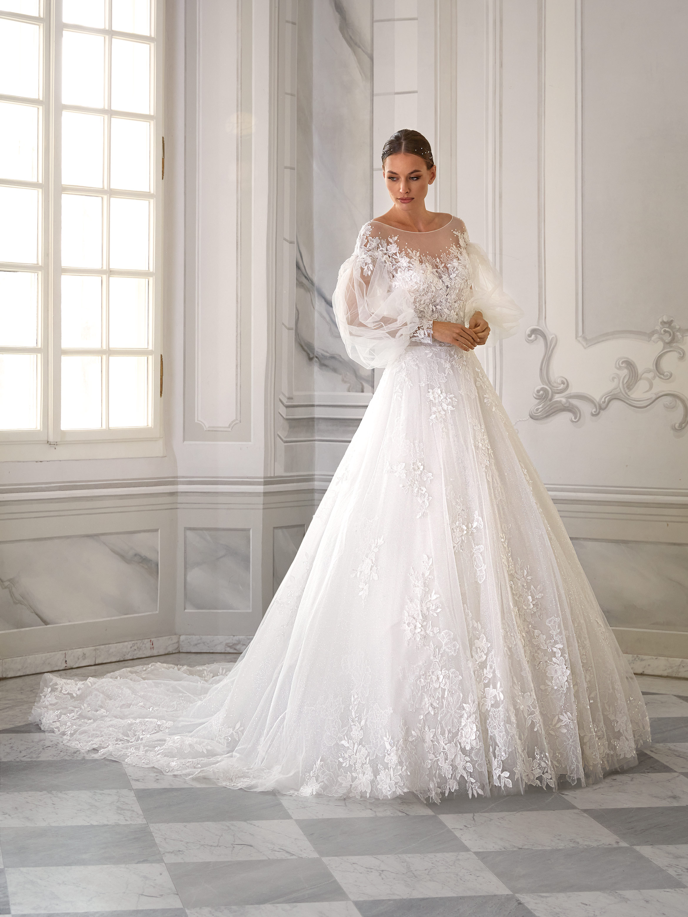 Noelle is a gown that blends airy tulle with rich 3D lace. The illusion bodice is adorned with delicate floral appliqués that flow into soft tulle sleeves finished with elegant cuffs. The glittering skirt and sweeping train complete this truly romantic and ethereal look.