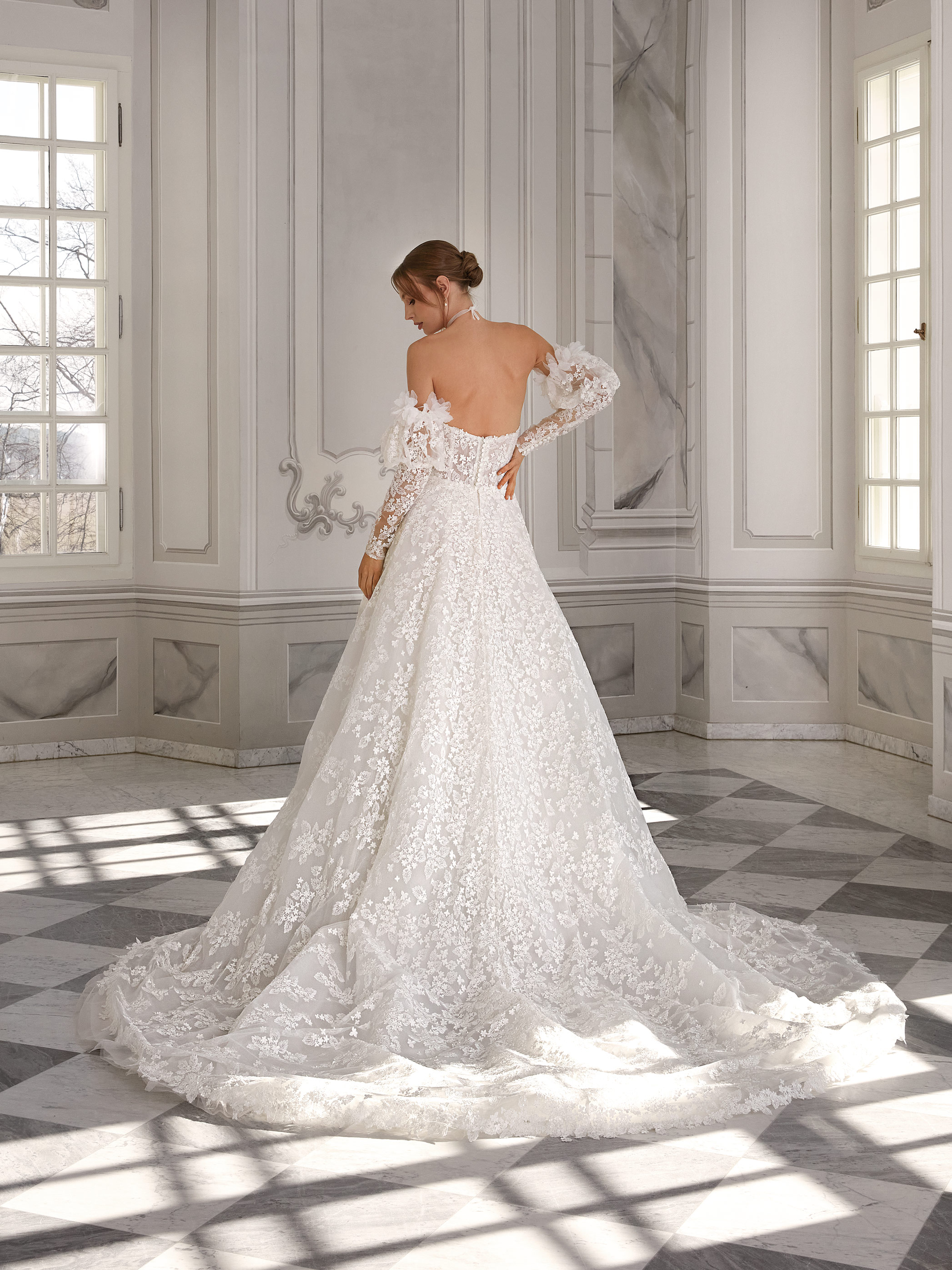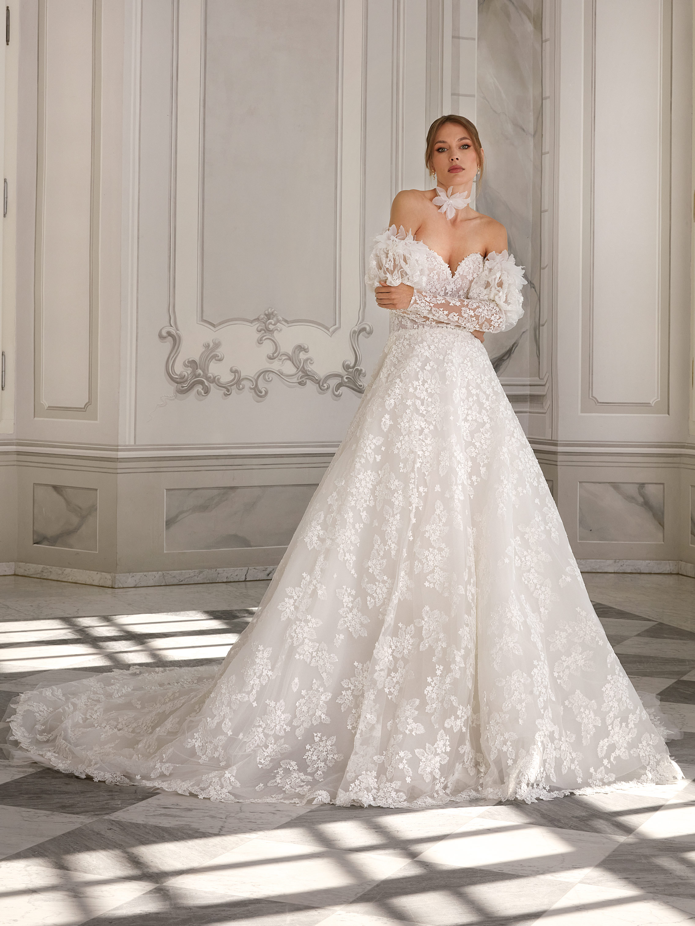 Romantic A-line wedding dress with a sweetheart bodice and long lace puffed sleeves with 3D floral details. The entire gown is covered with soft floral embroidery. A decorative flower choker adds a special touch. A light train completes the look.