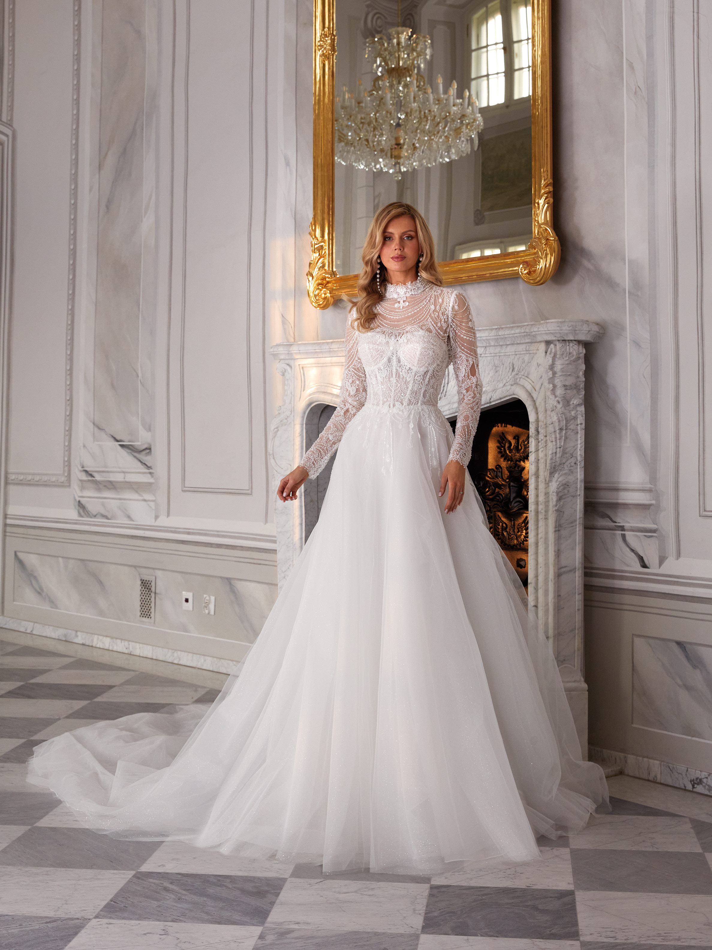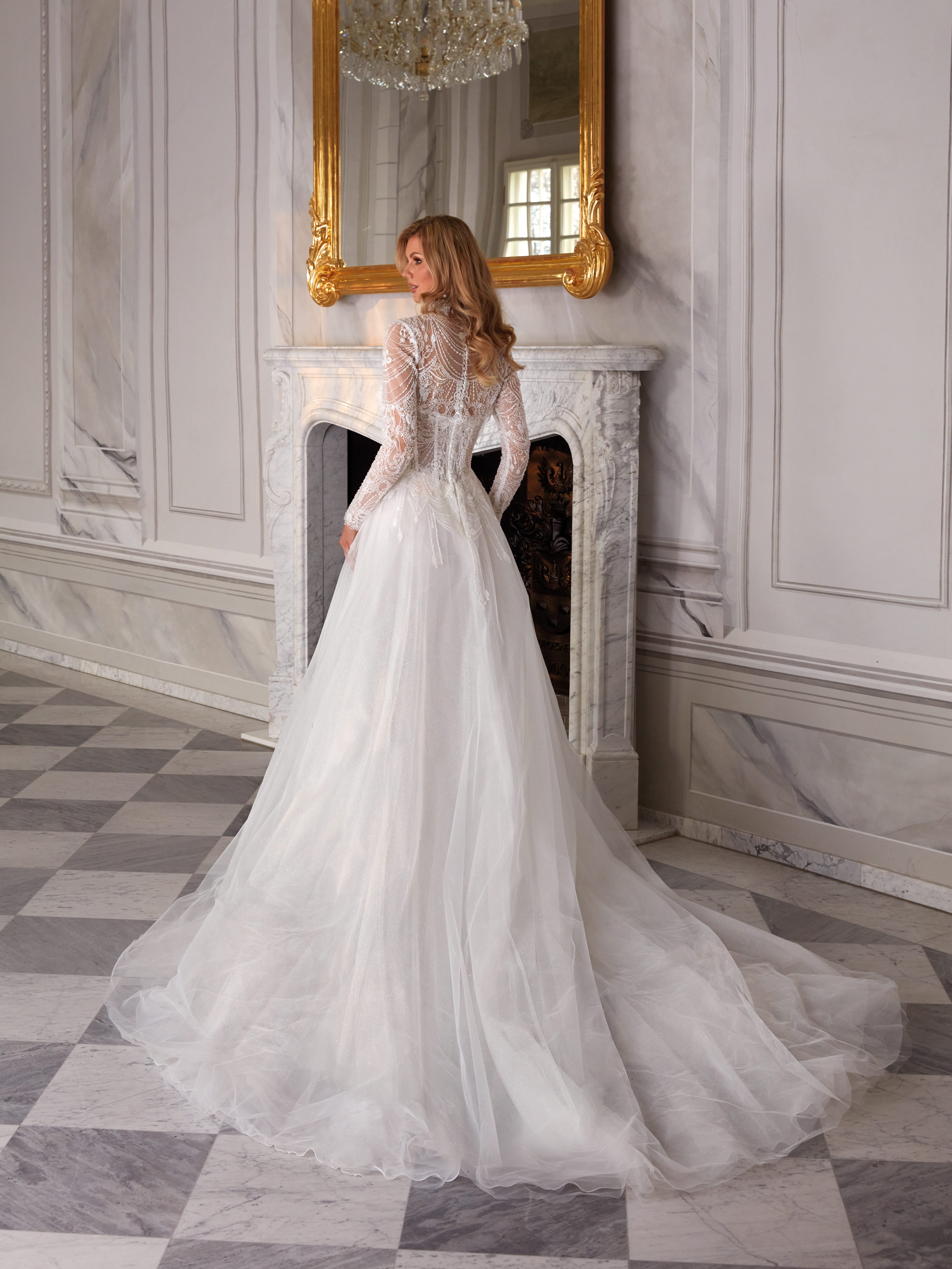 Parker is a majestic wedding gown perfect for brides who adore timeless elegance with a modern touch. The sheer, lace-embellished bodice features a high neckline and long sleeves, creating a regal, refined look. Intricate detailing along the back adds a luxurious finish, while the lightweight layered skirt with a flowing train balances the ornate top with graceful movement. Ideal for the bride seeking vintage-inspired splendor