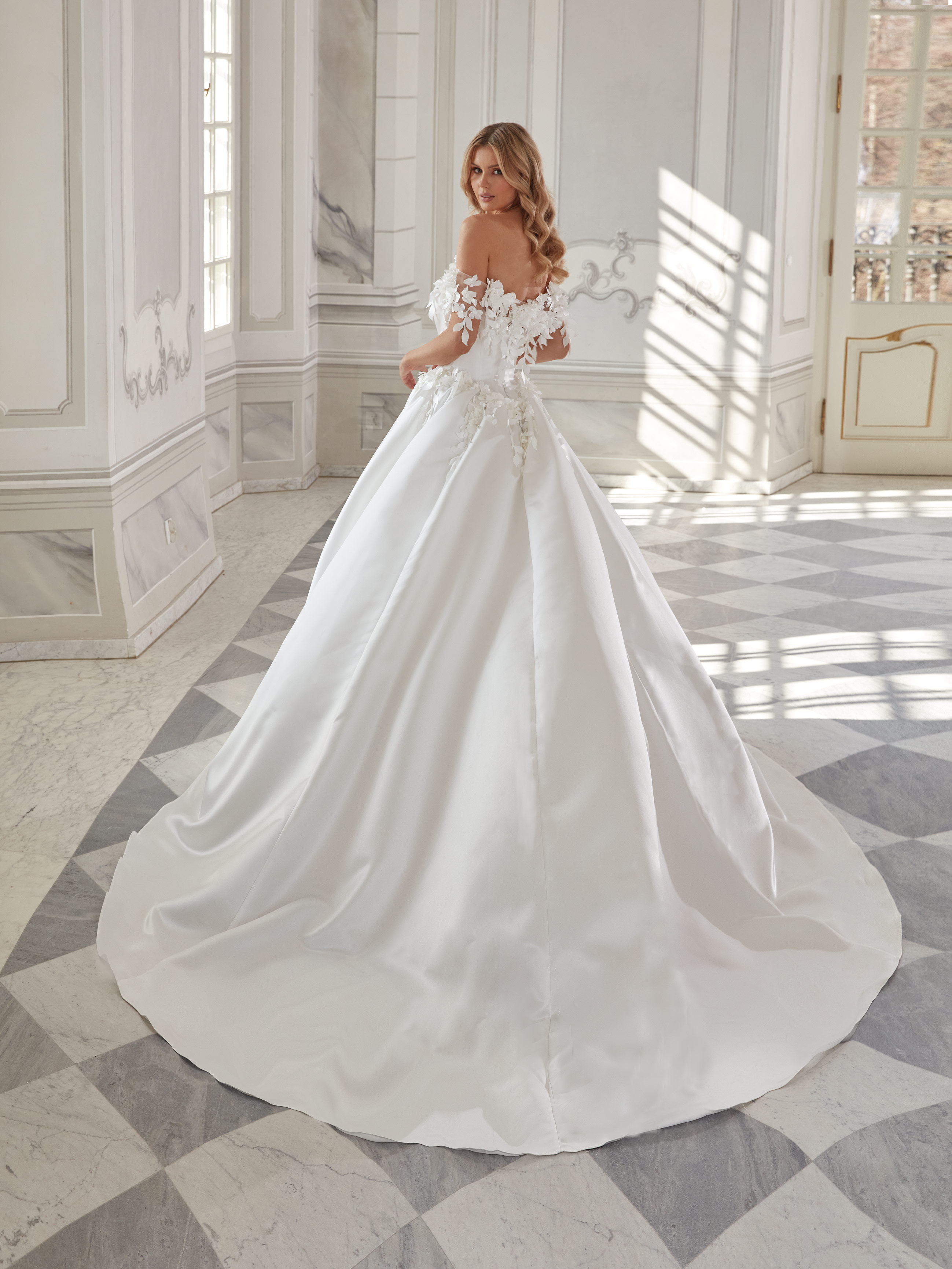 Pauline features a soft, off-the-shoulder bodice with delicate 3D floral details. The fitted waist flows into a voluminous, shiny skirt. This gown blends romantic lightness with timeless elegance.