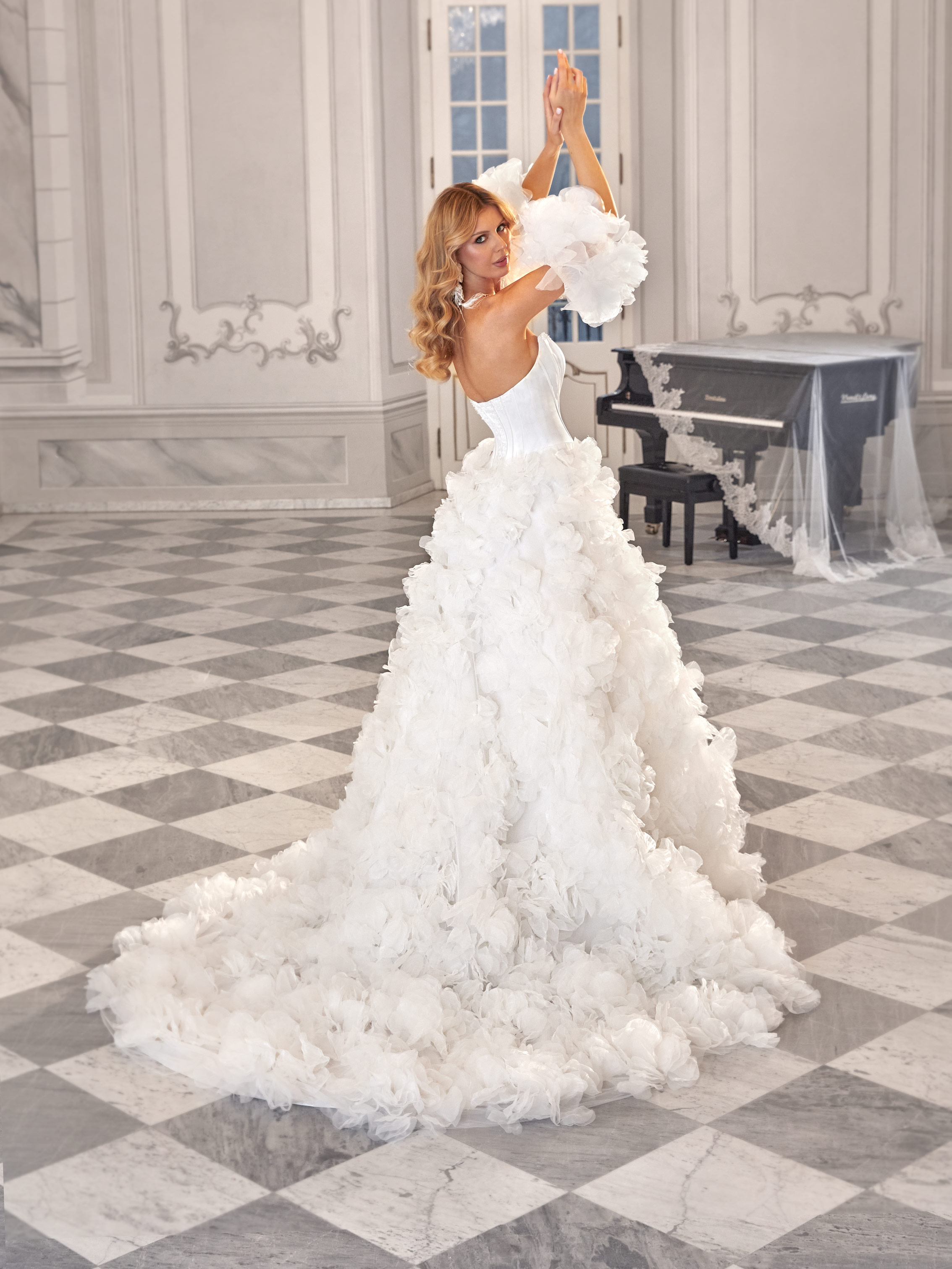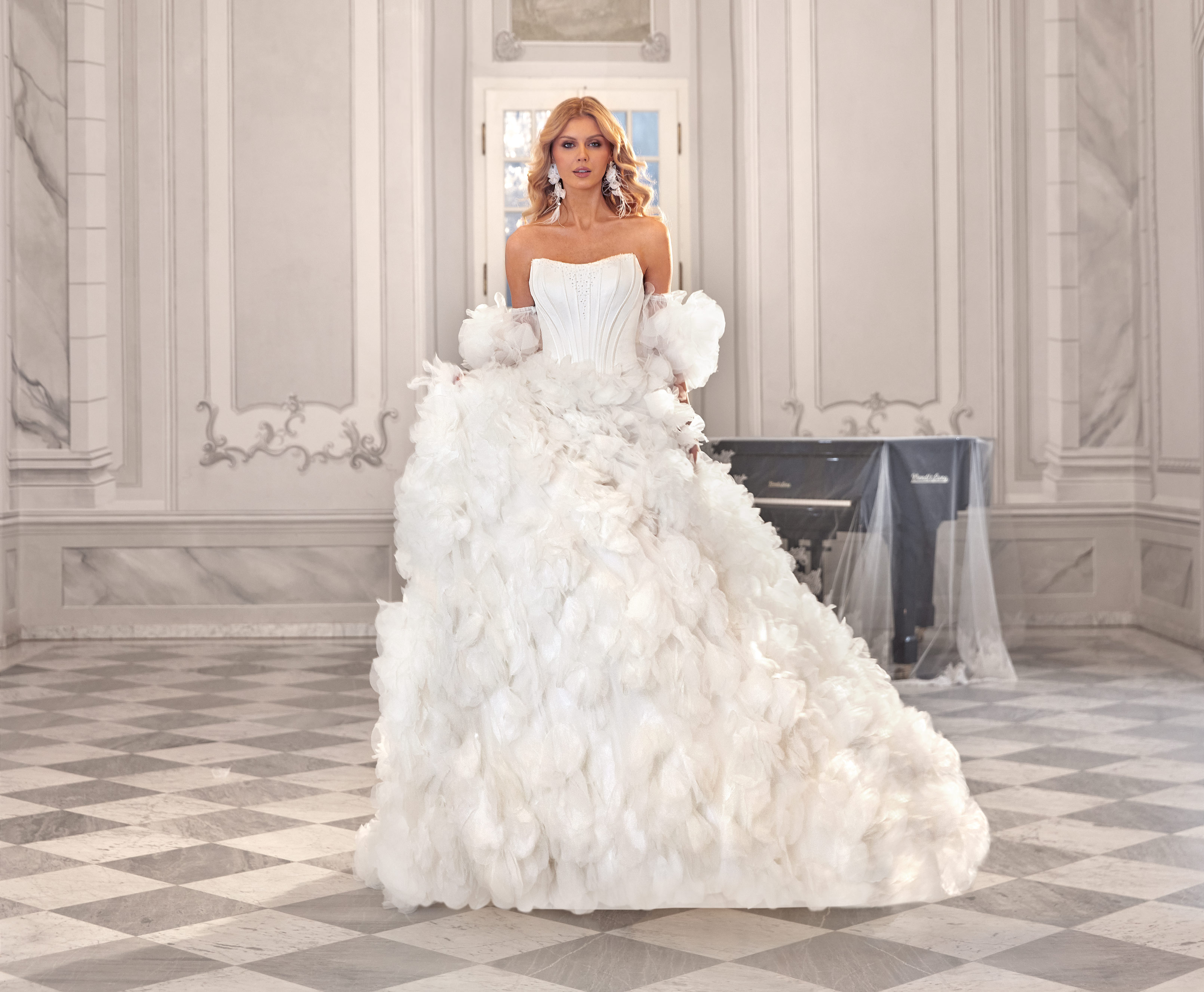 Perla is a spectacular gown with a straight-across embellished bodice and delicate off-the-shoulder tulle straps. The airy layered tulle skirt flows beautifully into a graceful train, creating a breathtaking bridal look.