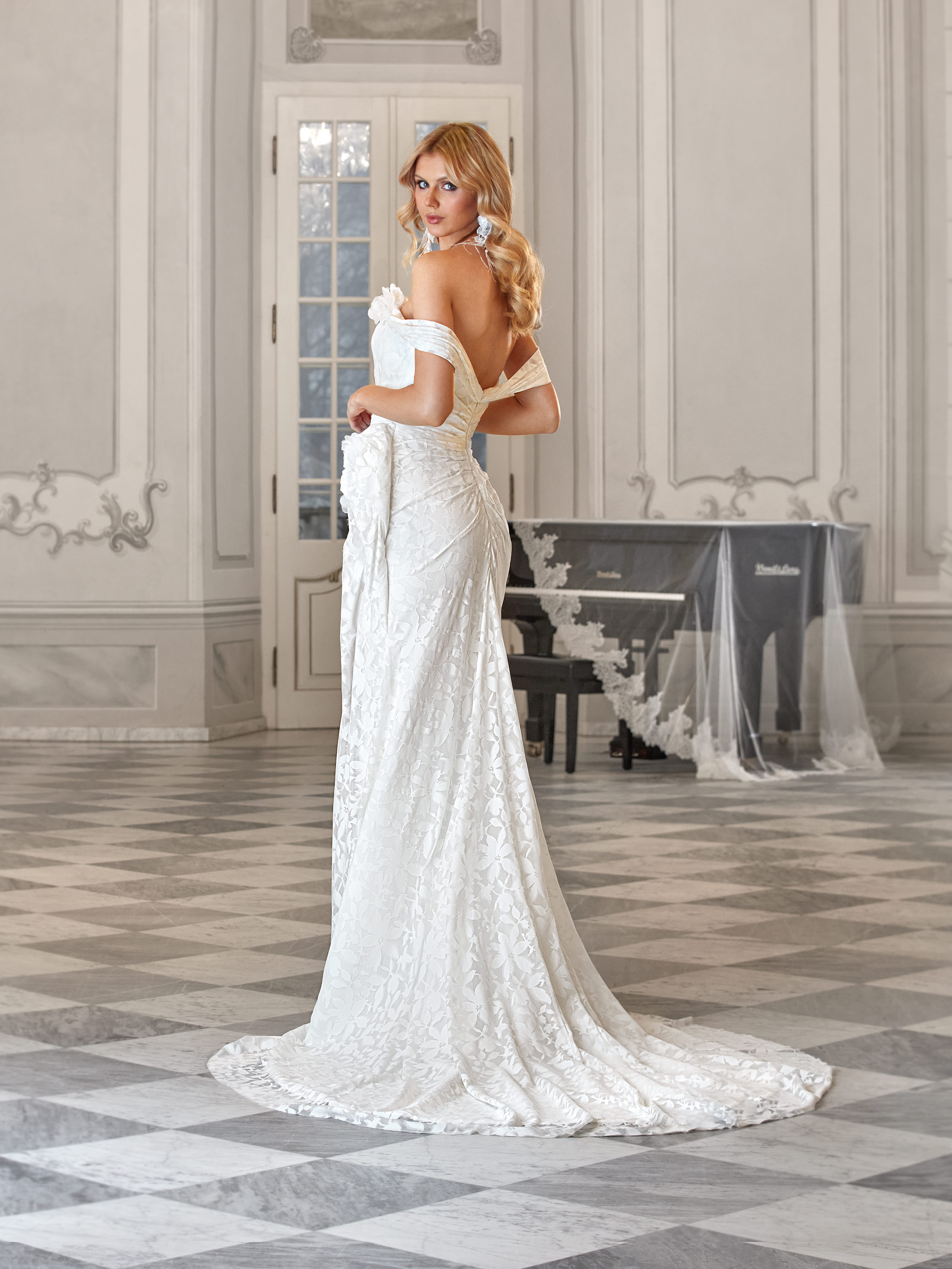 The Priscilla gown is a perfect choice for a bride who embraces timeless elegance with a modern touch. Its fitted silhouette accentuates the figure, while the intricate lace brings softness and romance. The strapless bodice features delicate off-the-shoulder sleeves and a floral applique at the neckline. A deep slit adds lightness and allure, and the subtle train flows gracefully as you move.