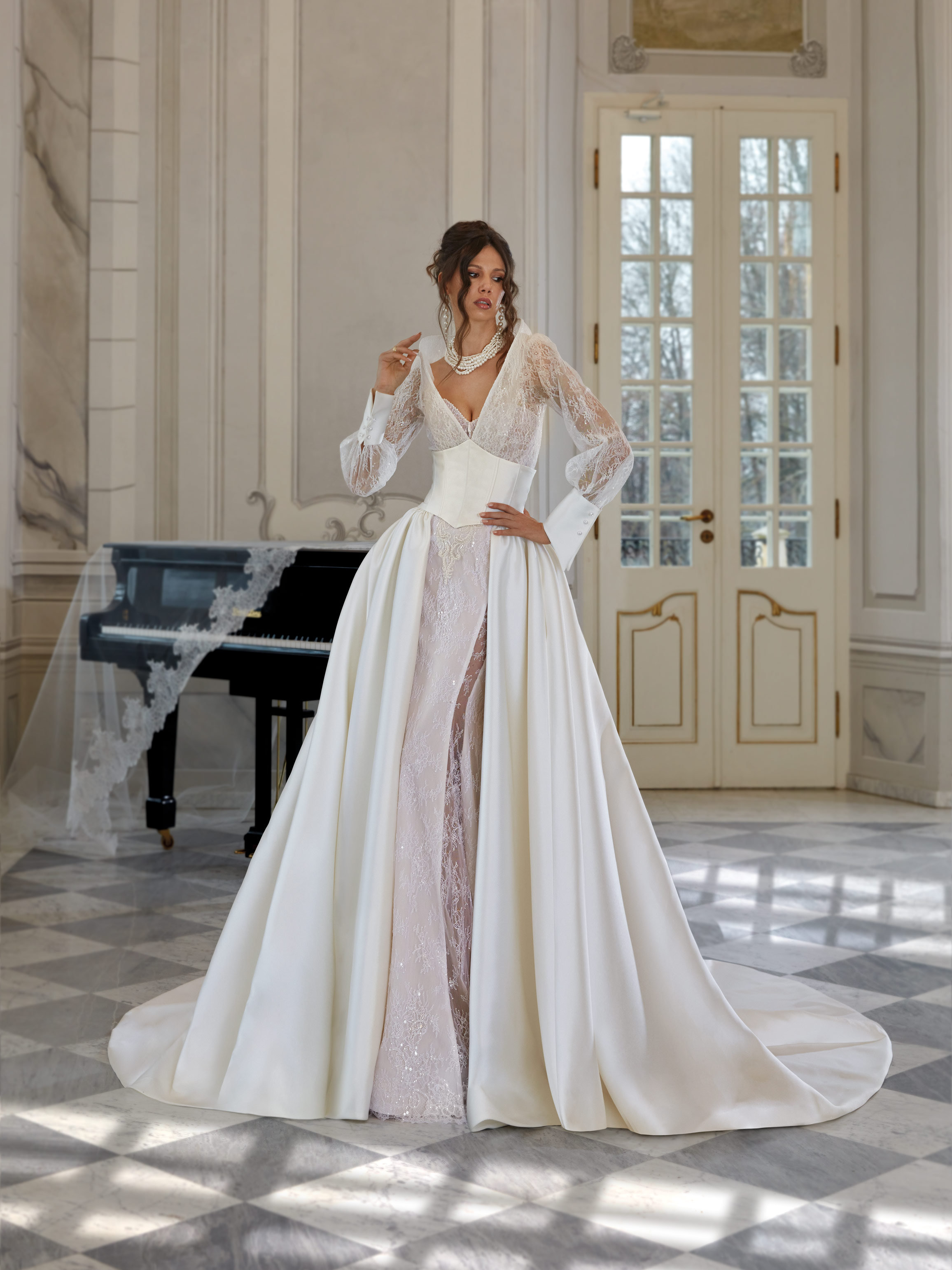 Romina is a design full of contrast and expression. The combination of a structured satin corset with a dramatic overskirt and a sensual lace base creates a show-stopping silhouette. The sheer bolero with voluminous sleeves and wide satin cuffs adds character and elegance.