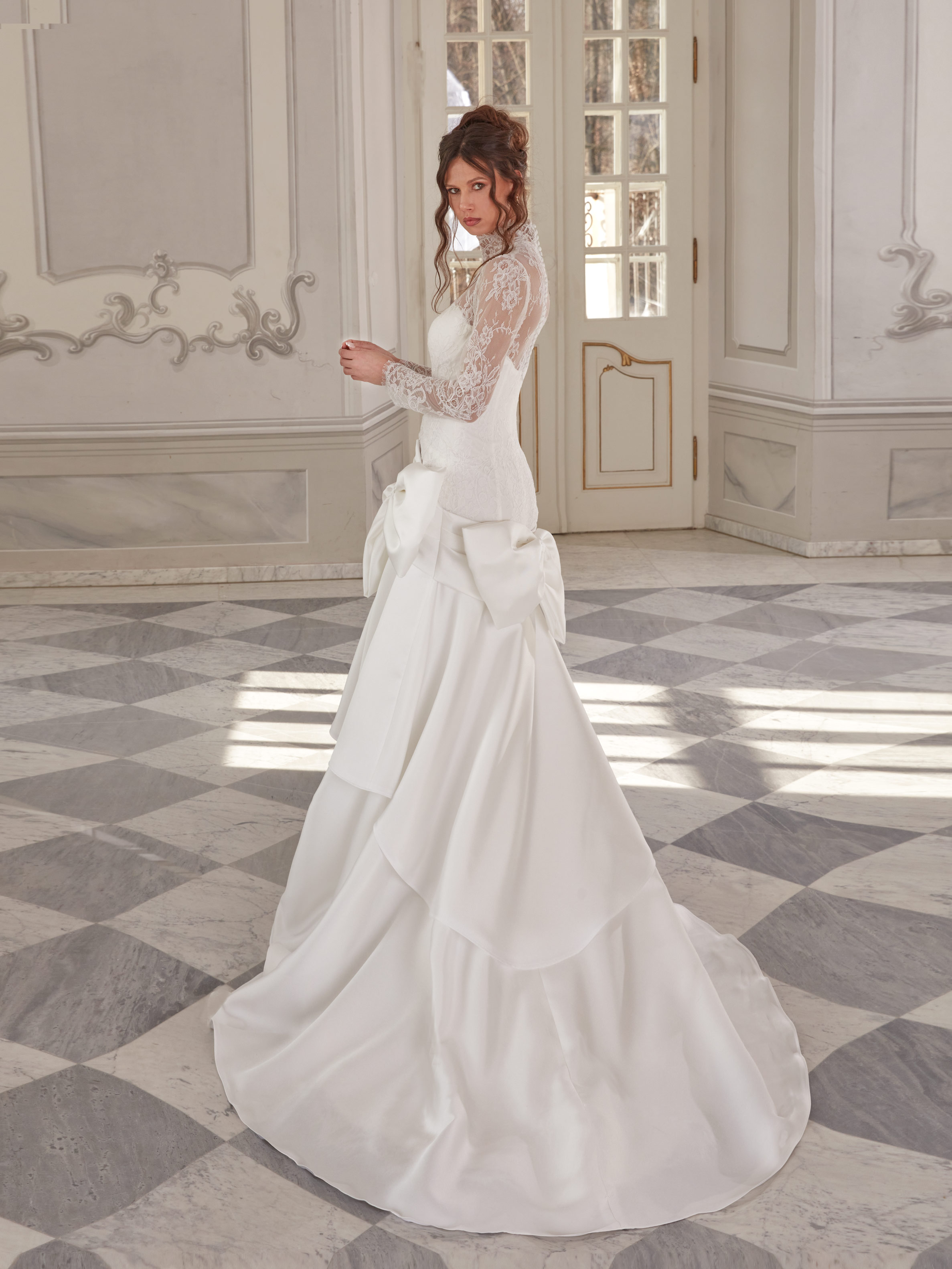 The front bow and flared satin-layered skirt give Rose a romantic shape. The fitted bodice enhances the silhouette, while the lace bolero with long sleeves and a high collar adds timeless elegance.