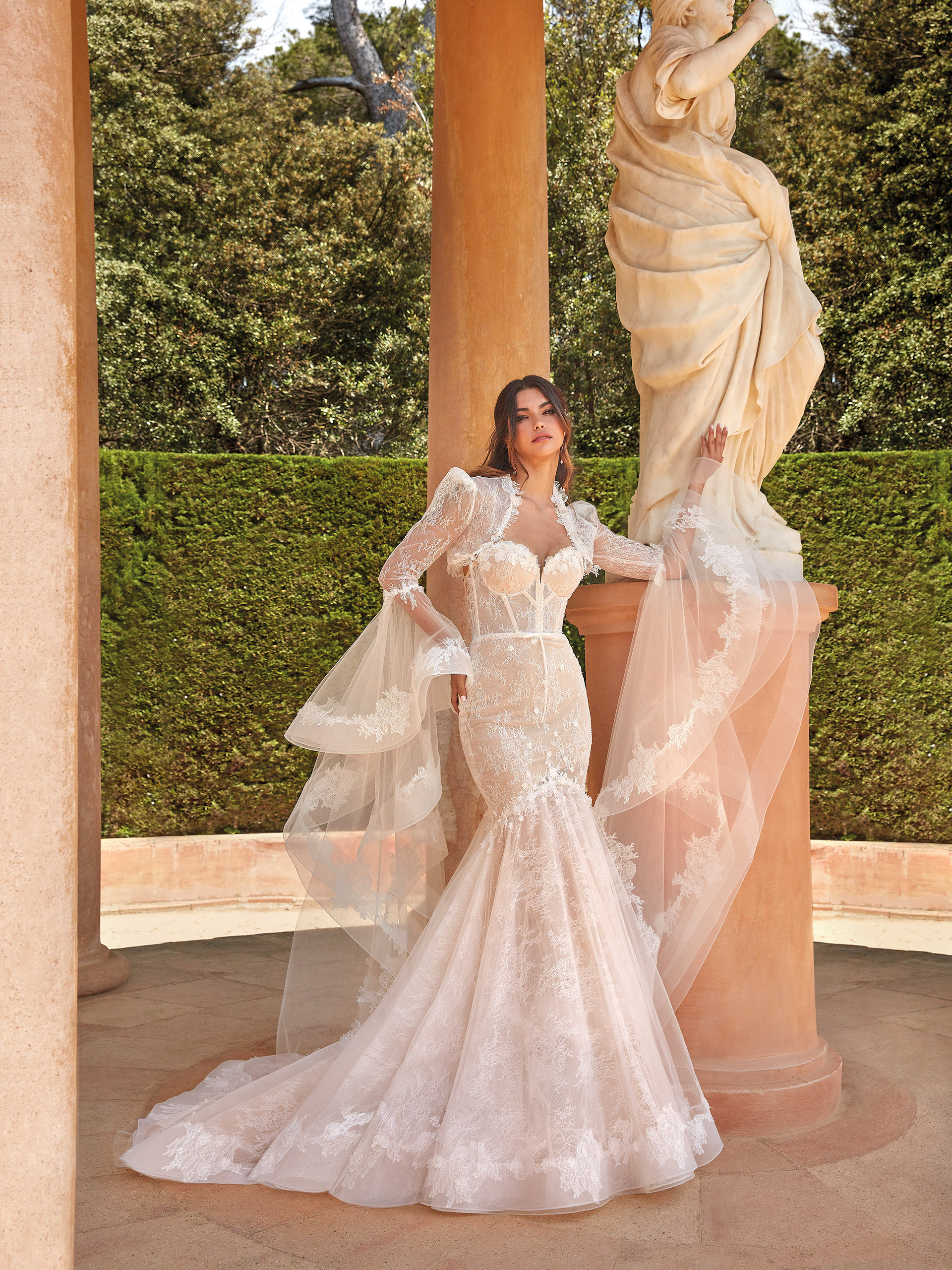 The sensual Sienna wedding dress in a fitted silhouette embodies elegance and romance. Made from delicate French lace adorned with hand-crafted 3D flowers, the dress captivates with its refined beauty. The bolero with long sleeves featuring floor-length ruffles adds a unique touch to the gown. The train gracefully flows behind the bride, creating a spectacular final effect.