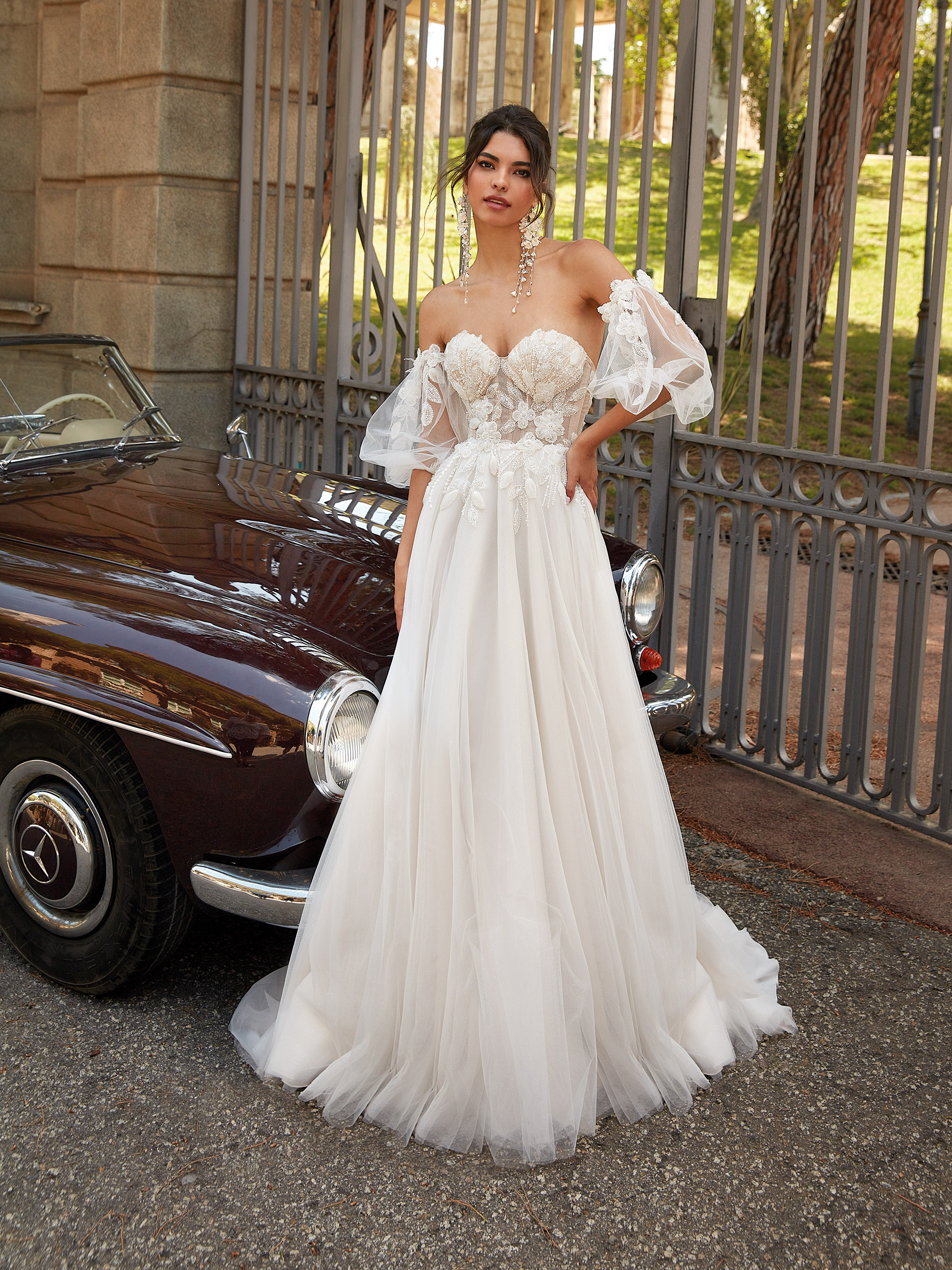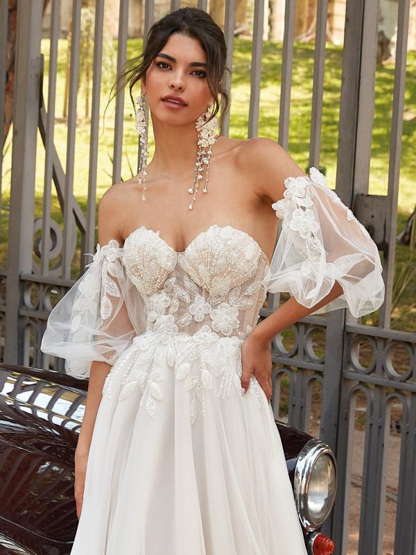 The romantic Sovia wedding dress combines delicacy with elegance. The semi-transparent bodice adorned with lace appliqués accentuates the feminine silhouette, adding a touch of subtle sensuality to the gown. The long, airy skirt ensures lightness and fluidity of movement, creating an ethereal effect. Tulle sleeves with lace details complete the look, giving the dress a romantic and refined character.